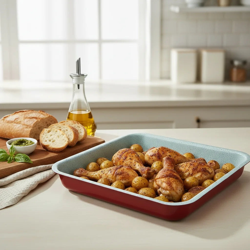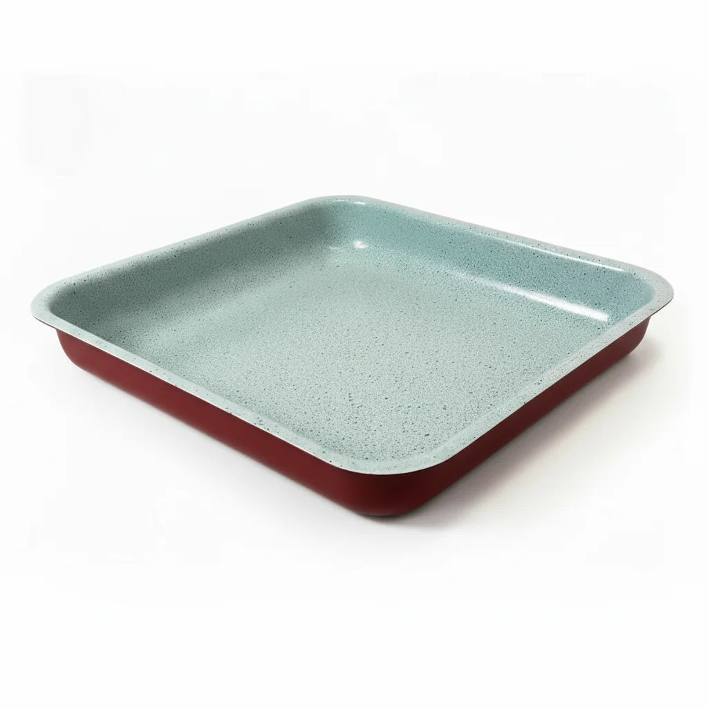 Ανακαλύψτε την πρακτική πλευρά της μαγειρικής με αυτό το συμπαγές ορθογώνιο ταψί φούρνου, ειδικά σχεδιασμένο για να καλύπτει τις ανάγκες μικρών νοικοκυριών ή φοιτητικών εστιών. Ο συνδυασμός του μοντέρνου κόκκινου εξωτερικού με την εσωτερική επίστρωση τύπου πέτρας (marble effect) προσφέρει μια καλαίσθητη λύση που ταιριάζει σε κάθε κουζίνα, επιτρέποντας το σερβίρισμα απευθείας στο τραπέζι.
