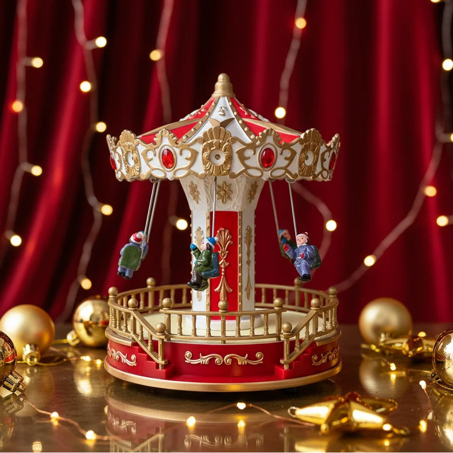 Ένα μαγικό χριστουγεννιάτικο carousel που ζωντανεύει τις γιορτές με μουσική, κίνηση και φως. Συνδέεται στην πρίζα και περιστρέφεται απαλά, ενώ παίζει γιορτινές μελωδίες που γεμίζουν τον χώρο με νοσταλγία και χαρά. Οι φιγούρες των παιδιών σε κούνιες, τα χρυσά στολίδια και η λεπτομερής κατασκευή το καθιστούν ιδανικό για συλλογή ή ως εντυπωσιακό centerpiece.