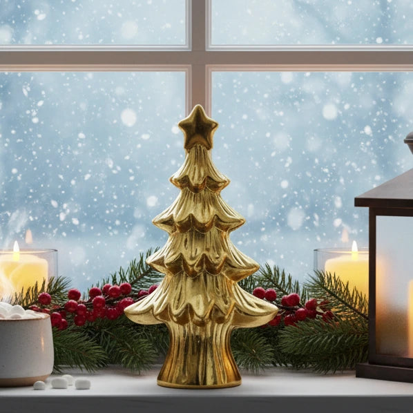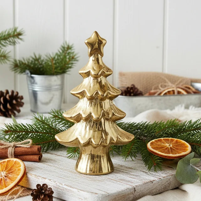 Αναδείξτε τη γιορτινή σας διακόσμηση με αυτό το κομψό χρυσό δέντρο, σχεδιασμένο για να προσθέσει λάμψη και στυλ σε κάθε χώρο. Με στιλιζαρισμένη μορφή τριών επιπέδων και αστέρι στην κορυφή, το διακοσμητικό αυτό αποπνέει minimal αισθητική και μοντέρνα φινέτσα.