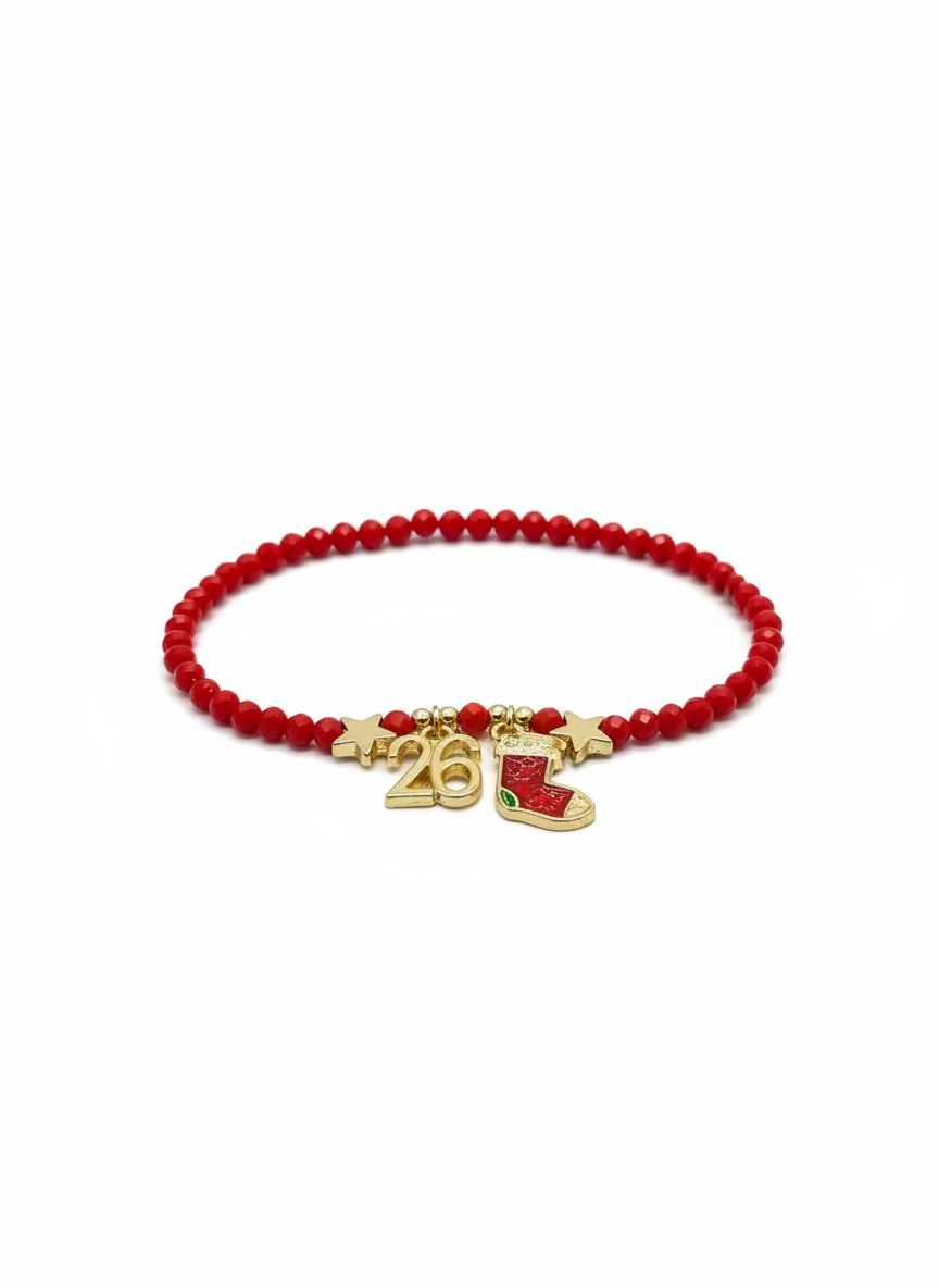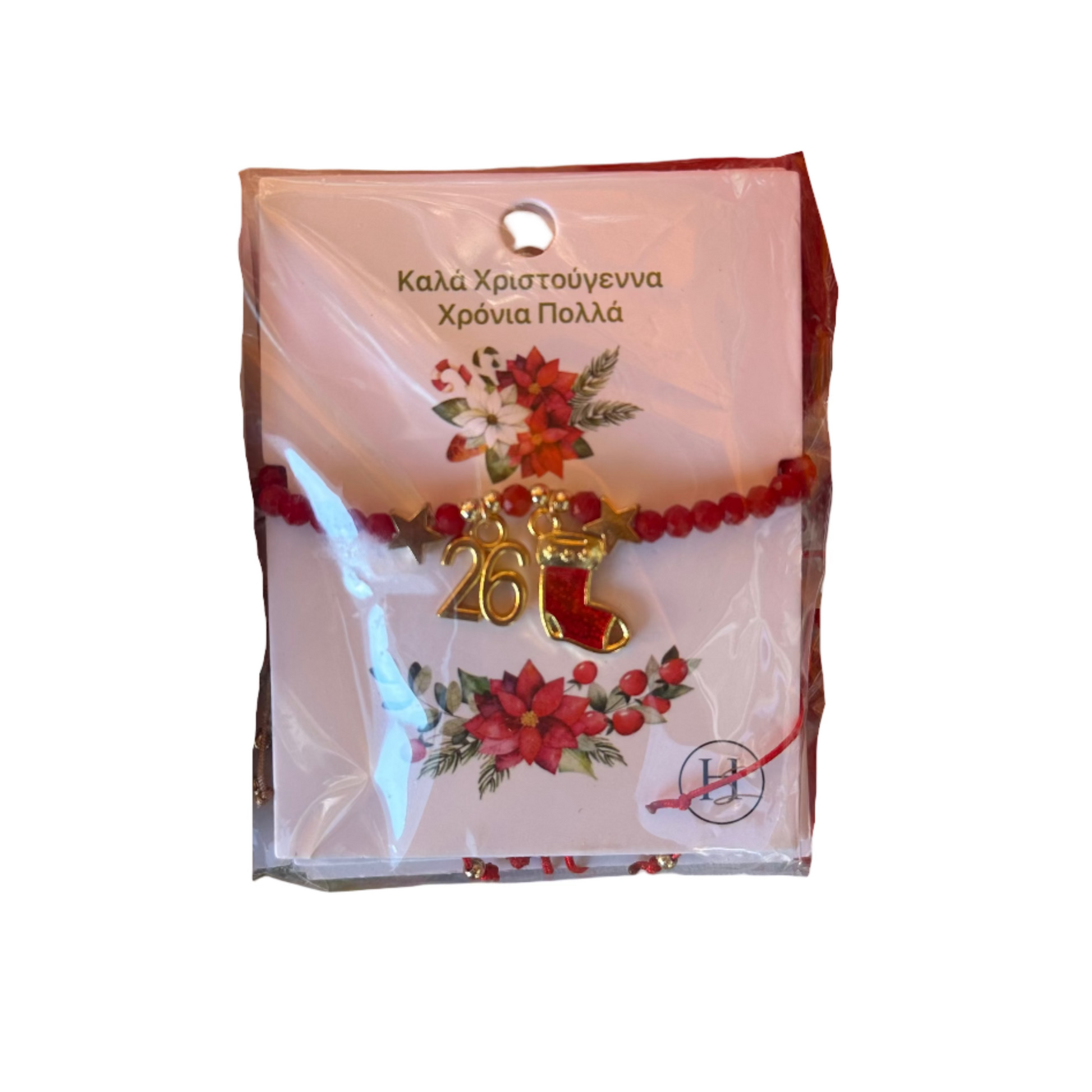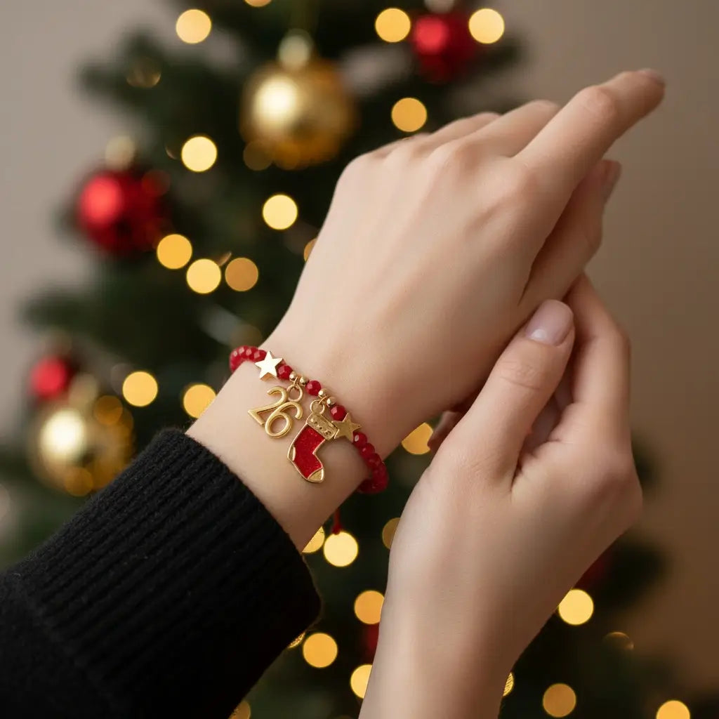 Αναδείξτε το γιορτινό σας στυλ με ένα βραχιόλι που τραβάει τα βλέμματα. Το κόκκινο κορδόνι συμβολίζει τη ζεστασιά των Χριστουγέννων, ενώ τα χρυσά charms—όπως το “25”, η κάλτσα και τα αστέρια—προσθέτουν λάμψη και παιχνιδιάρικη διάθεση.