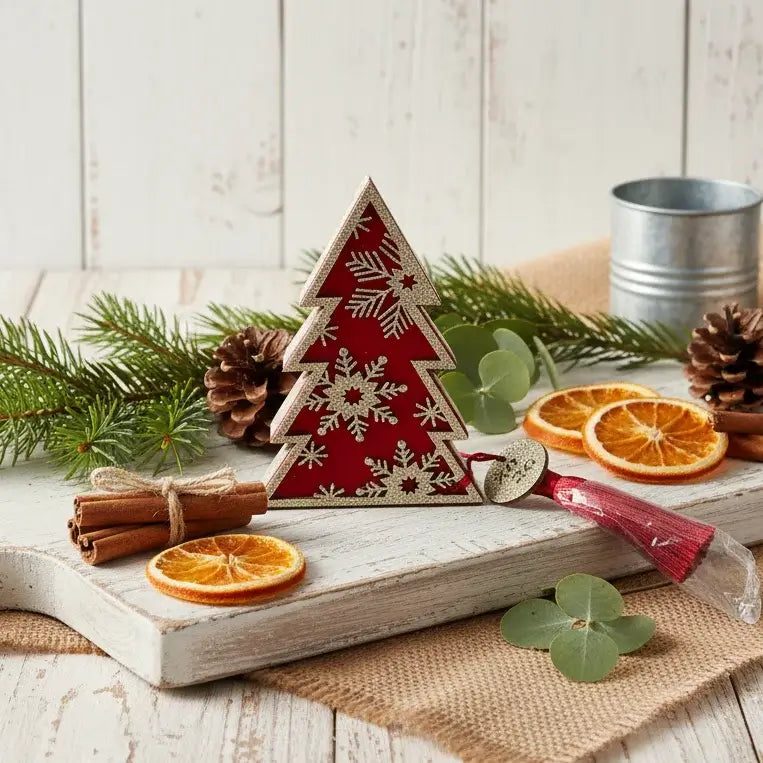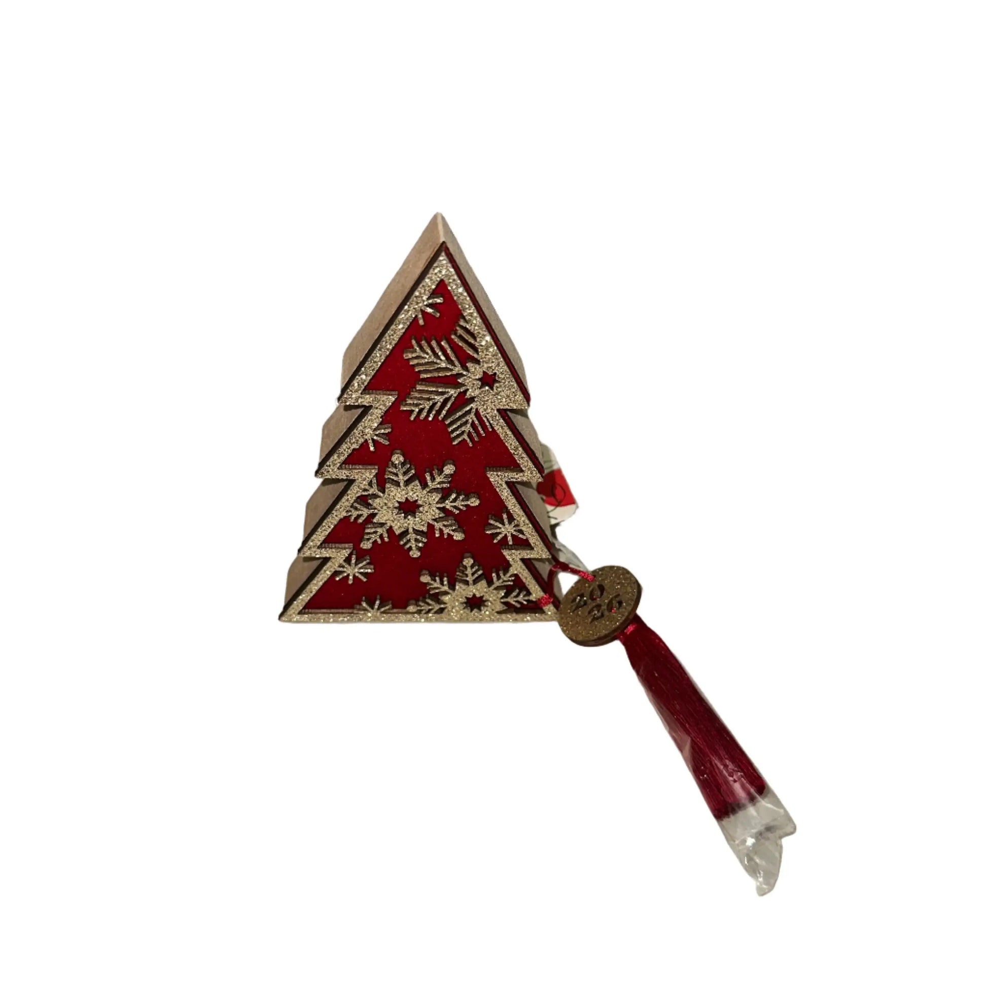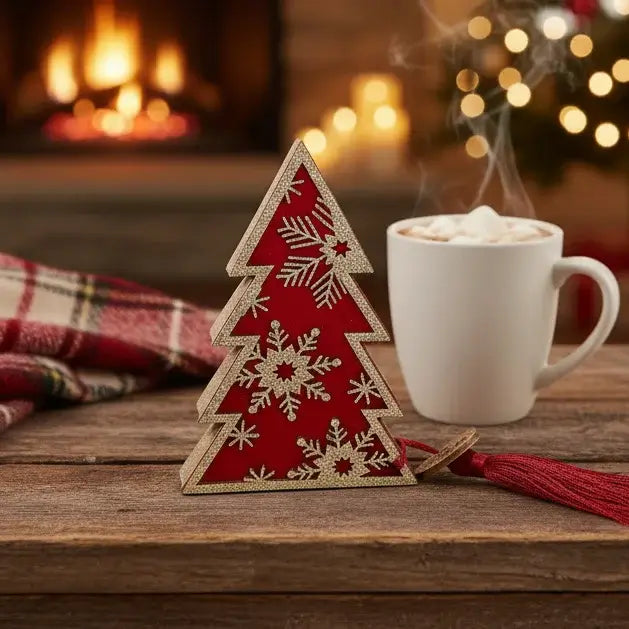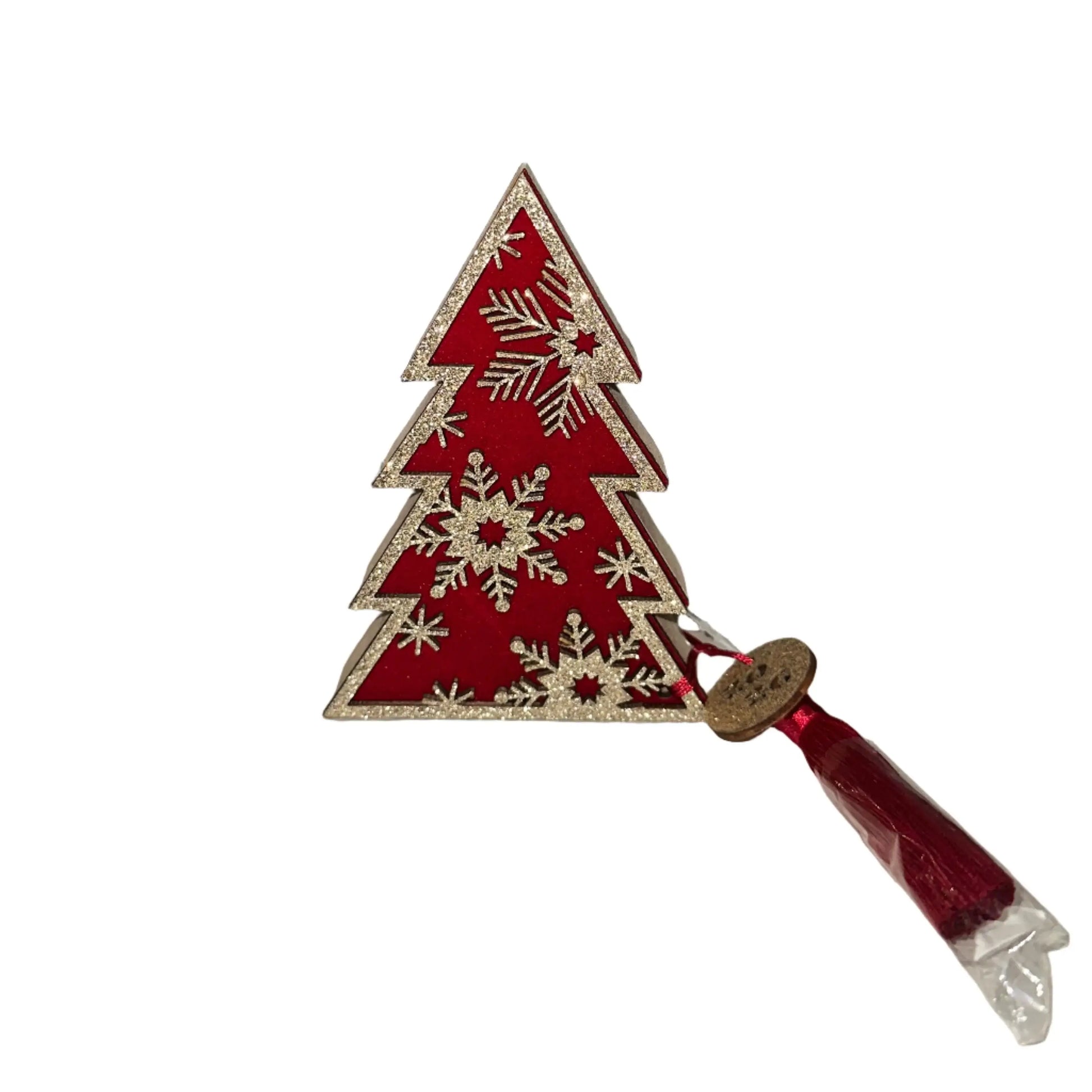 Ανανεώστε τη γιορτινή σας διακόσμηση με αυτό το εντυπωσιακό χριστουγεννιάτικο γούρι σε σχήμα δέντρου, σχεδιασμένο για να φέρει τύχη, ζεστασιά και στυλ στο χώρο σας. Το δέντρο είναι κατασκευασμένο από κόκκινο υλικό και διακοσμημένο με χρυσό glitter που σχηματίζει χιονονιφάδες και γεωμετρικά μοτίβα, προσθέτοντας λάμψη και κομψότητα.