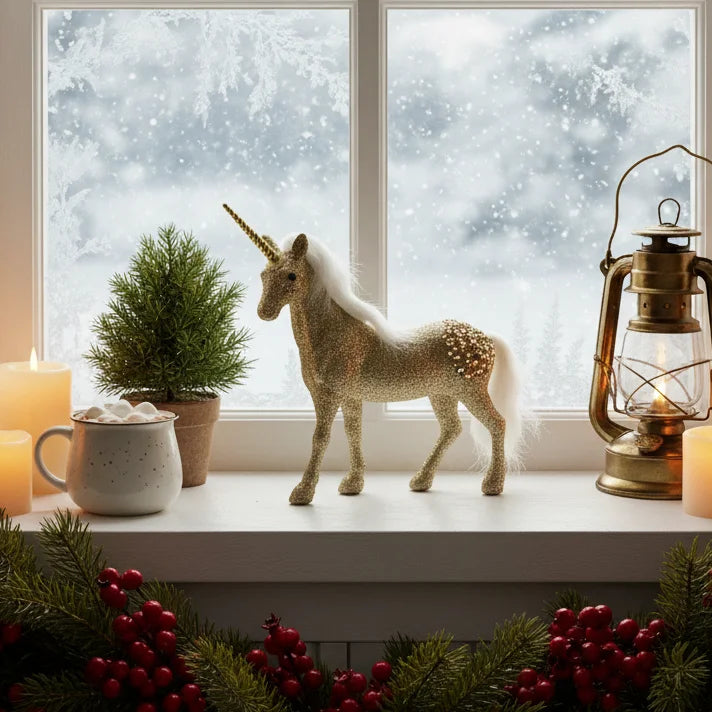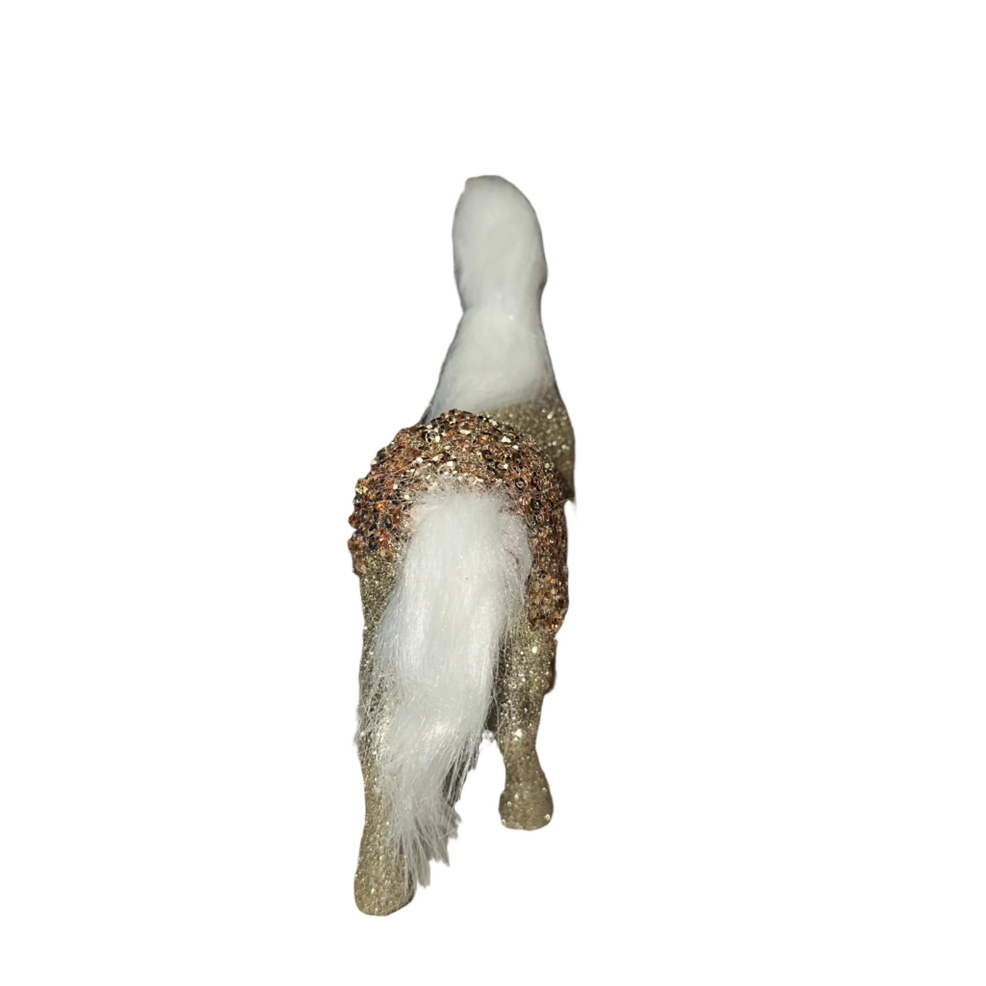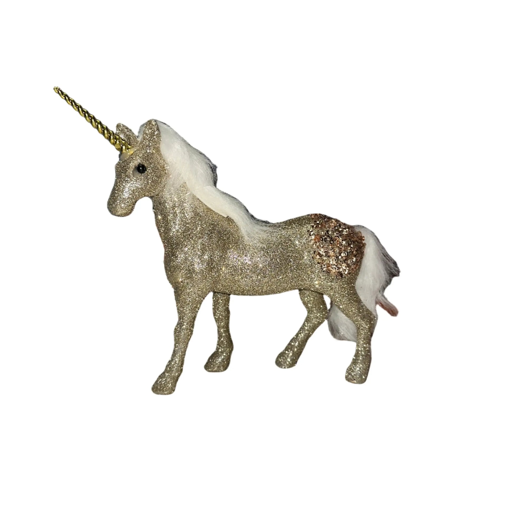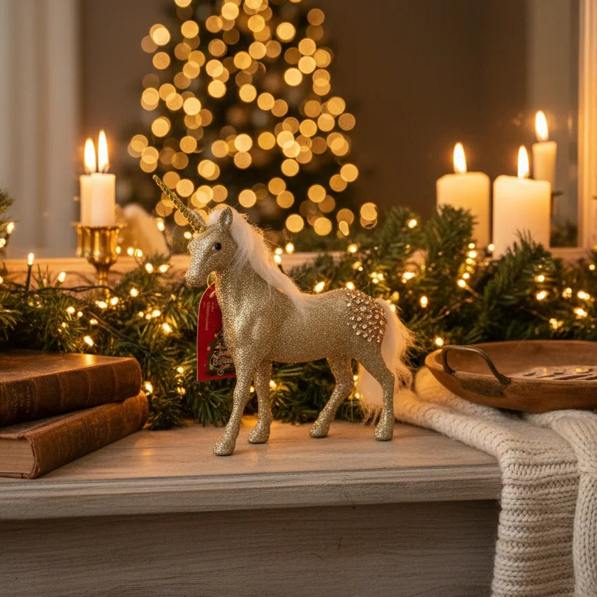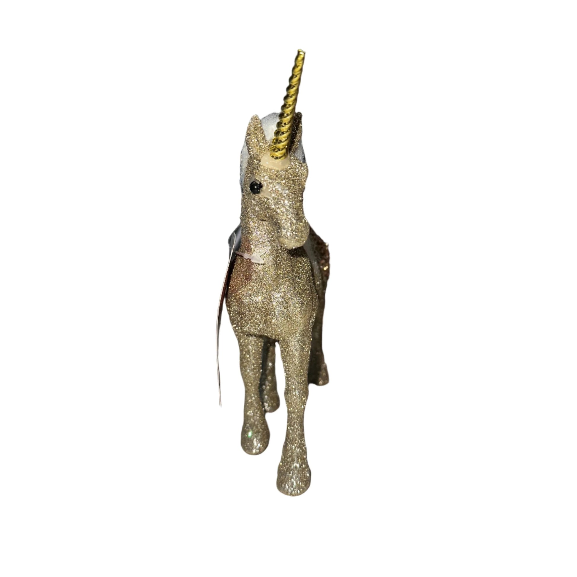 Ανακαλύψτε τη μαγεία των γιορτών με αυτόν τον εντυπωσιακό χρυσό μονόκερο, ένα διακοσμητικό που συνδυάζει φαντασία, λάμψη και εορταστική κομψότητα. Καλυμμένος με χρυσό glitter, με λευκή χαίτη και ουρά, και διακοσμημένος με περλέ λεπτομέρειες στα πίσω του πόδια, αυτός ο μονόκερος αποπνέει παραμυθένια γοητεία.