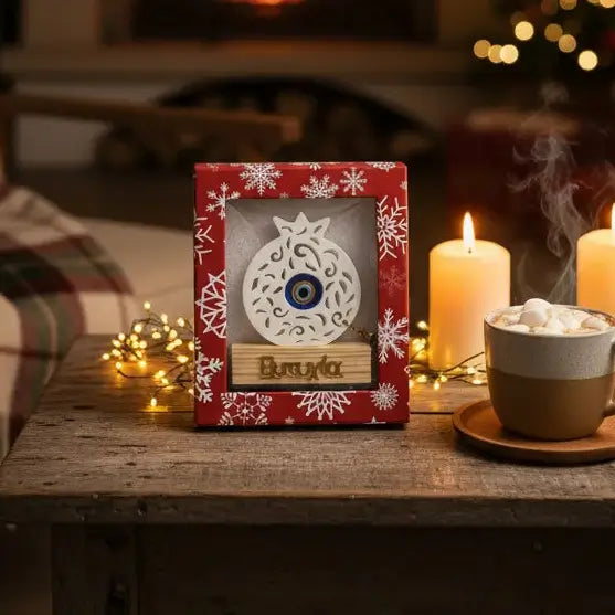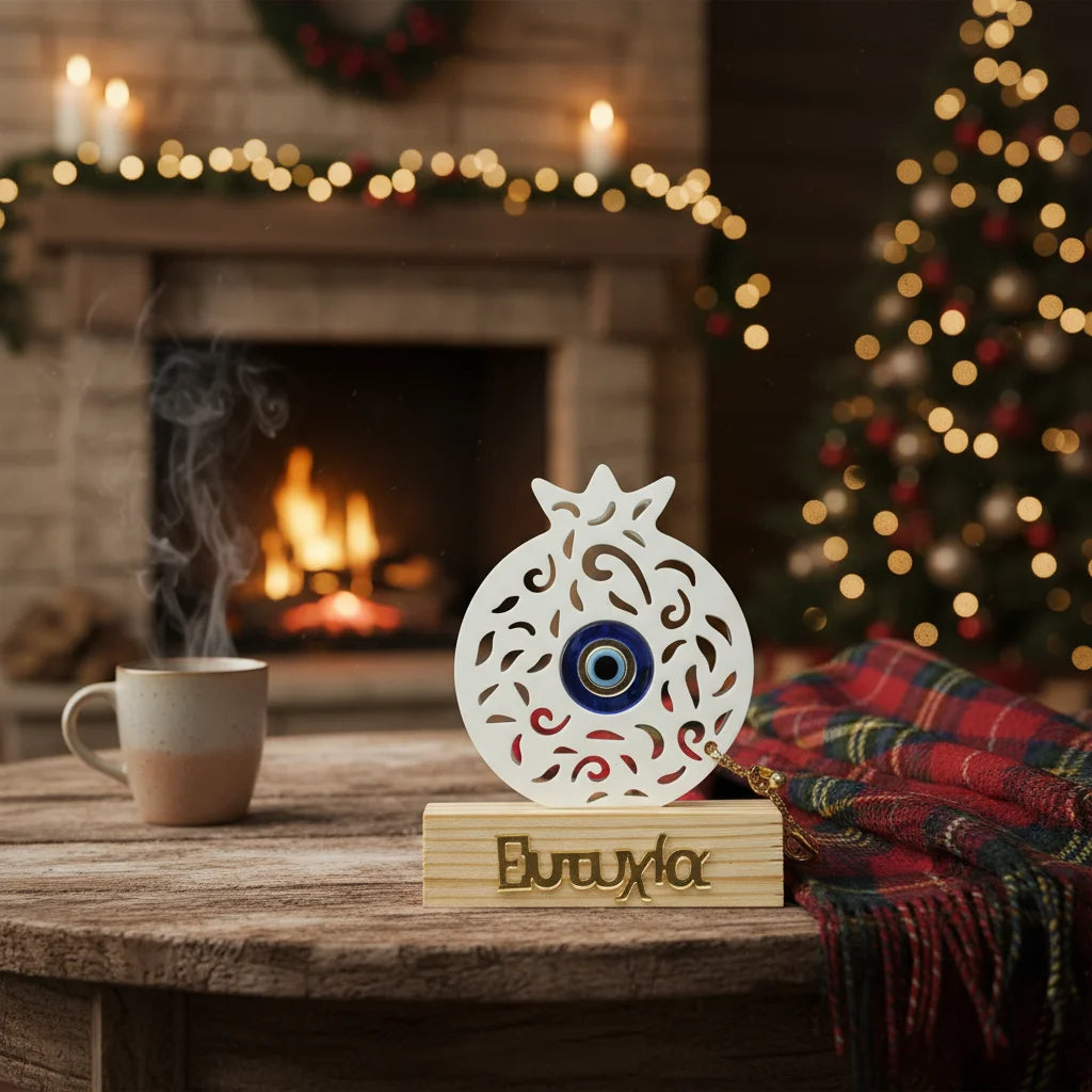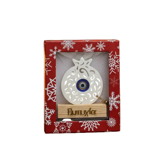 Με λευκό ή κόκκινο ρόδι, μπλε μάτι στο κέντρο και ξύλινη βάση με χρυσή επιγραφή, είναι ένα γούρι που δεν διακοσμεί απλώς — δηλώνει πρόθεση. Τοποθετημένο σε εορταστικό κουτί δώρου, είναι έτοιμο να προσφερθεί με νόημα και φροντίδα.