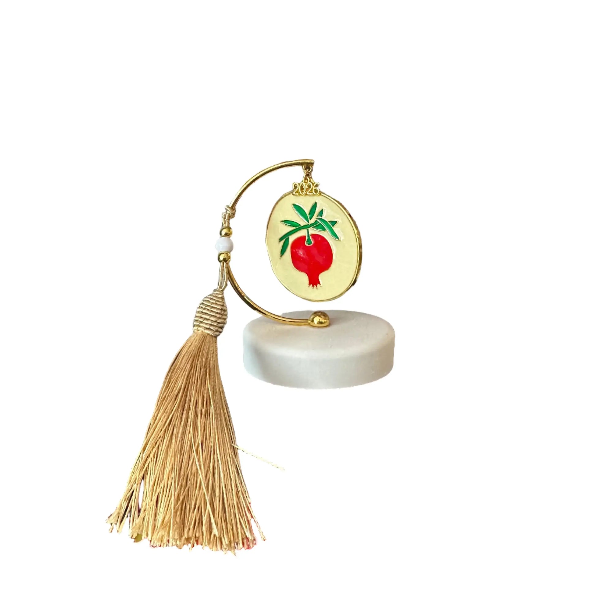 Τοποθετημένο σε χρυσή ημισέληνο, με λευκή βάση και φούντα, το ρόδι δεν είναι απλώς διακοσμητικό. Είναι ένα τελετουργικό αντικείμενο που δηλώνει: “Αυτή η χρονιά αξίζει να ανθίσει.”
