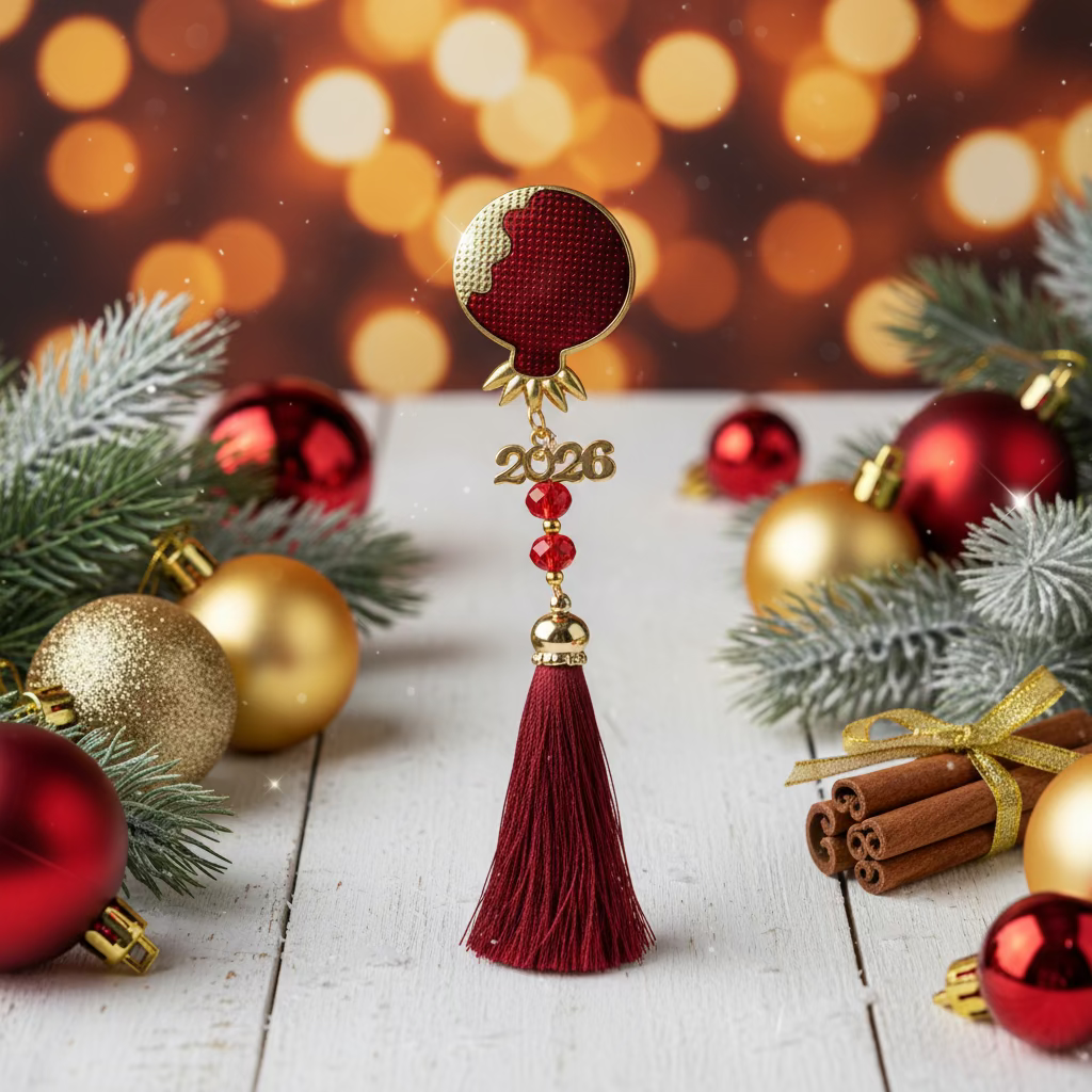 Με κόκκινο και χρυσό χρώμα, φούντα και χάντρες, το “Ρόδι” δεν διακοσμεί απλώς — ενεργοποιεί. Το “2026” στο κέντρο δηλώνει την χρονιά που ξεκινάς με πίστη. Η φούντα προσθέτει εορταστική ένταση, ενώ η συσκευασία το καθιστά έτοιμο για προσφορά.