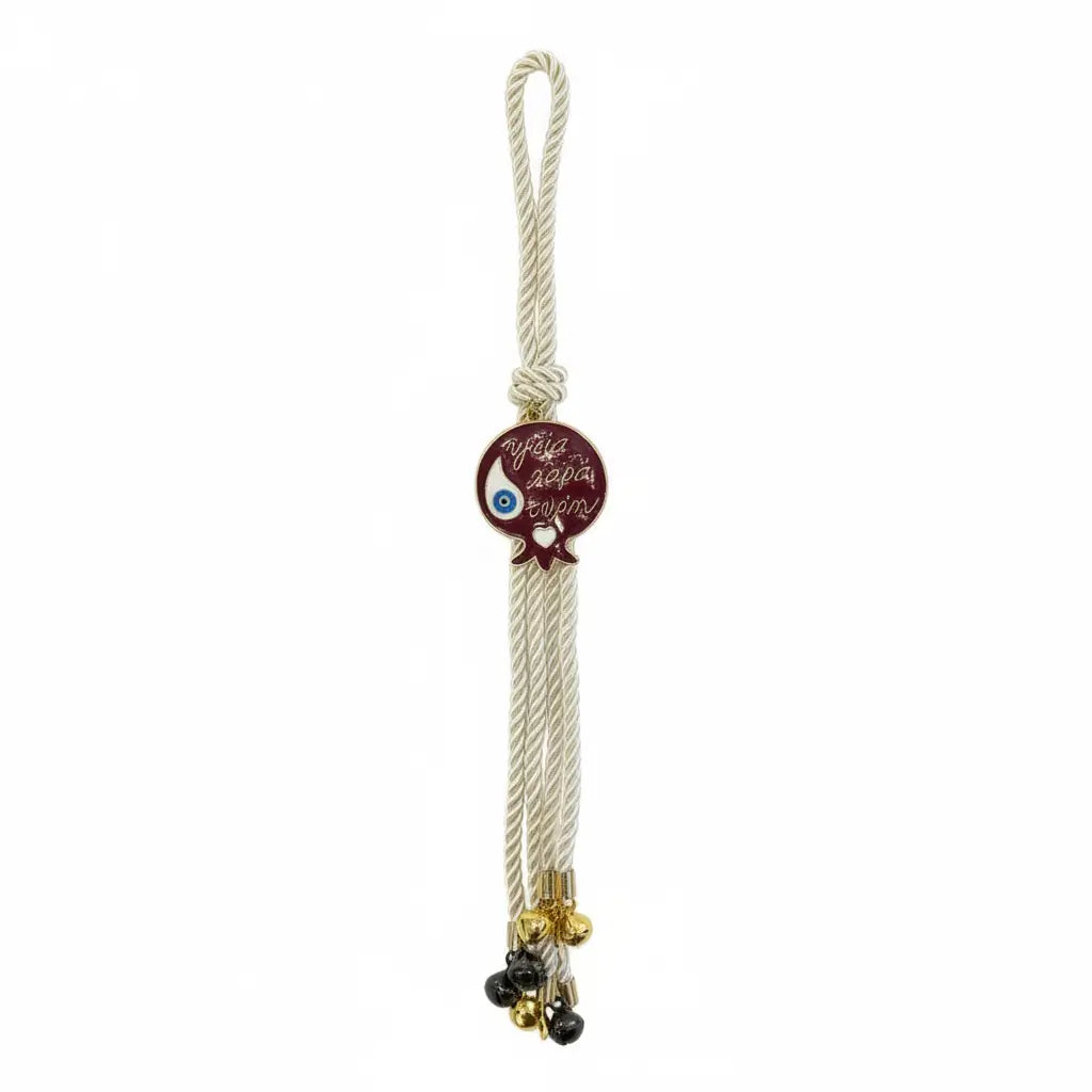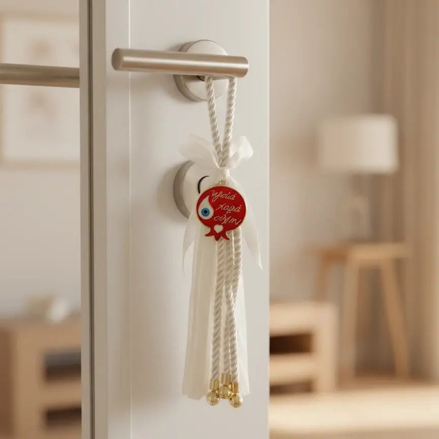 Ένα ξεχωριστό διακοσμητικό που συνδυάζει αισθητική και μήνυμα. Το κόκκινο μεταλλικό στοιχείο με το σύμβολο του yin-yang και τις λέξεις “Υγεία, Αγάπη, Ειρήνη” αποπνέει ισορροπία και θετική ενέργεια. Το λευκό στριφτό κορδόνι καταλήγει σε χρυσά και μαύρα καμπανάκια, δημιουργώντας μια διακριτική ηχητική νότα κάθε φορά που κινείται.