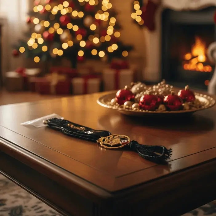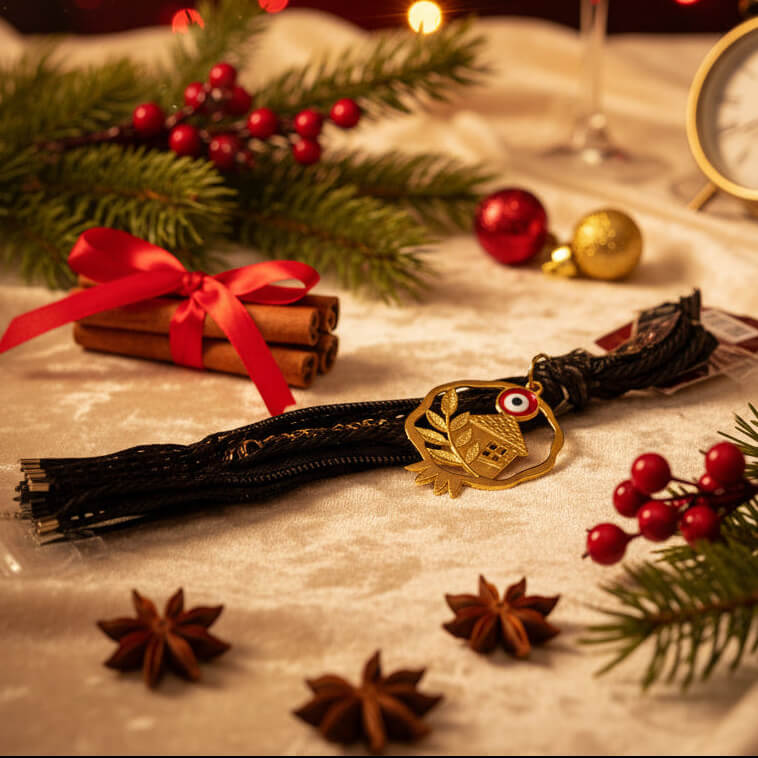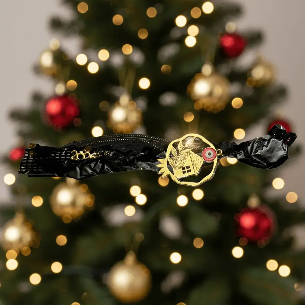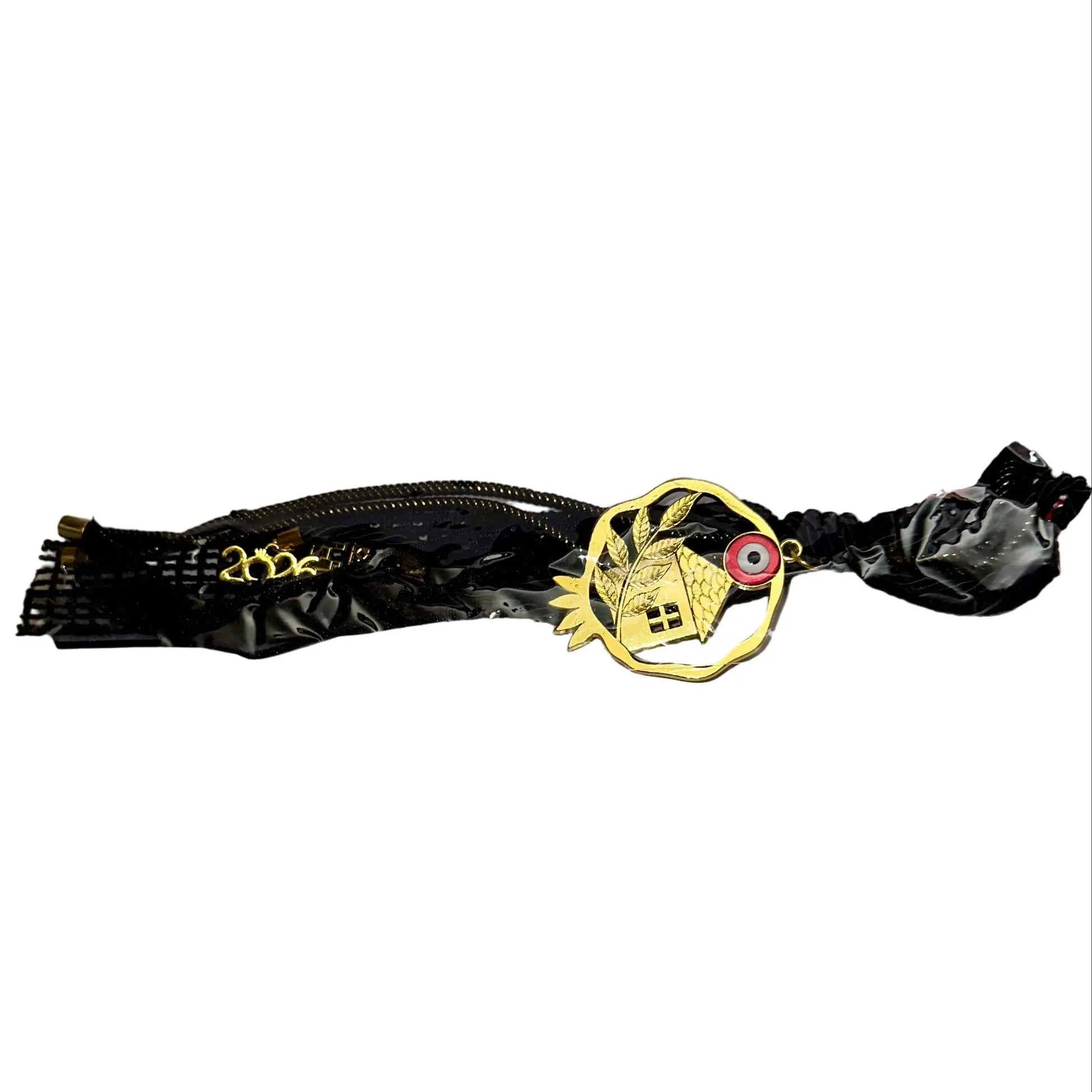 🏡 Χρυσό Σπιτάκι - Συμβολίζει το καταφύγιο, την οικογένεια, τη ζεστασιά του σπιτιού 🧿 Προστατευτικό Μάτι (Evil Eye) - Αρχαία παράδοση που απωθεί αρνητικές ενέργειες και το "μάτιασμα" 🖤 Μαύρη Μεταξωτή Φούντα - Αντιπροσωπεύει τη γείωση, τη δύναμη και την κομψότητα ✨ Χρυσές Λεπτομέρειες - Φως, ευημερία και θετική ενέργεια που ρέει στο χώρο