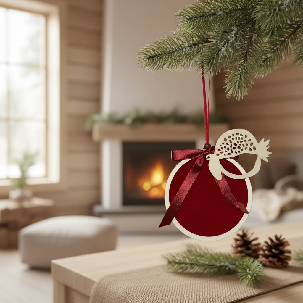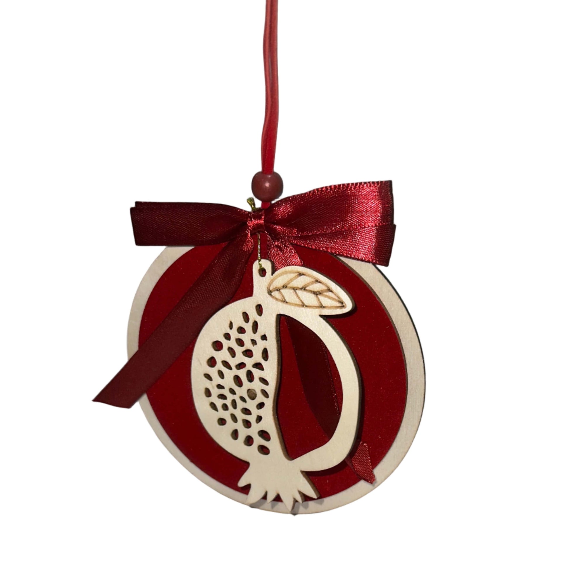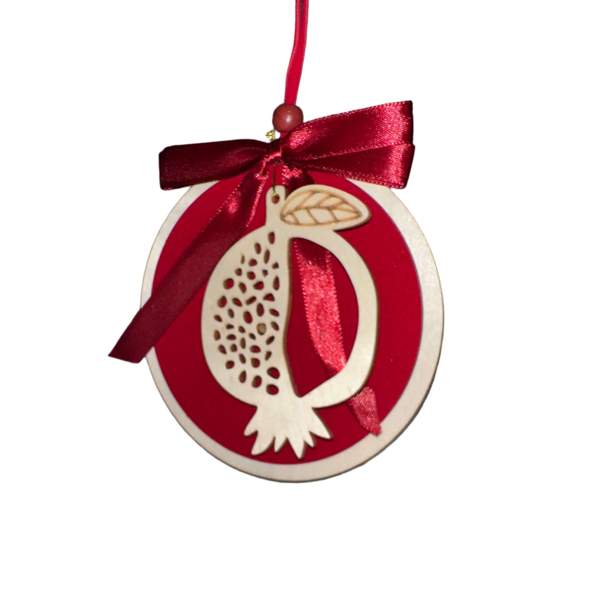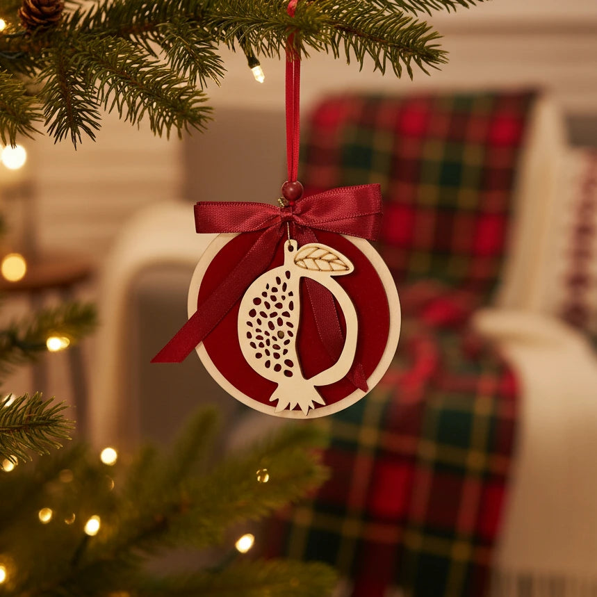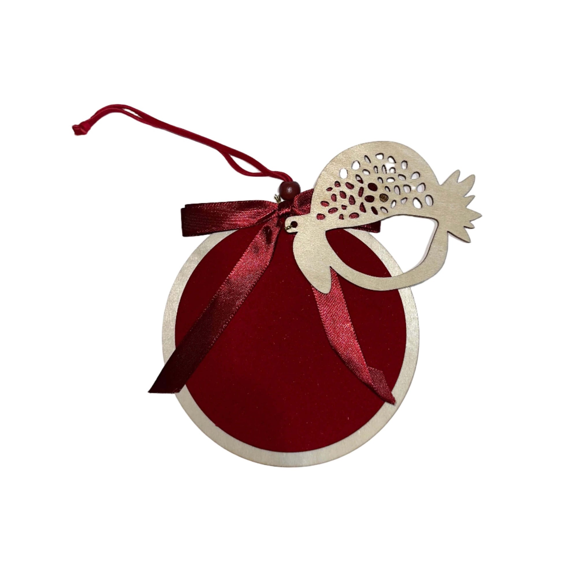 Κομψό χριστουγεννιάτικο στολίδι με σχέδιο ρόδι σε κυκλική ξύλινη βάση. Συνοδεύεται από πλούσια σατέν κορδέλα σε βαθύ κόκκινο χρώμα που προσθέτει πολυτελή πινελιά.