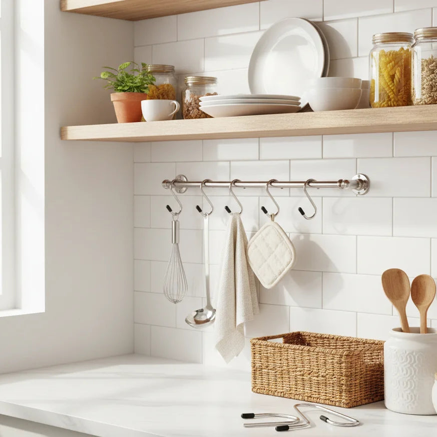 - Κουζίνα: Οργάνωση κουζινικών εργαλείων (κουτάλες, σπάτουλες), κρεμάστρα για κούπες ή πετσέτες σε ράγες.