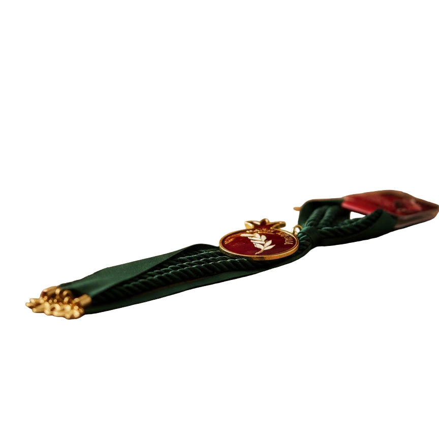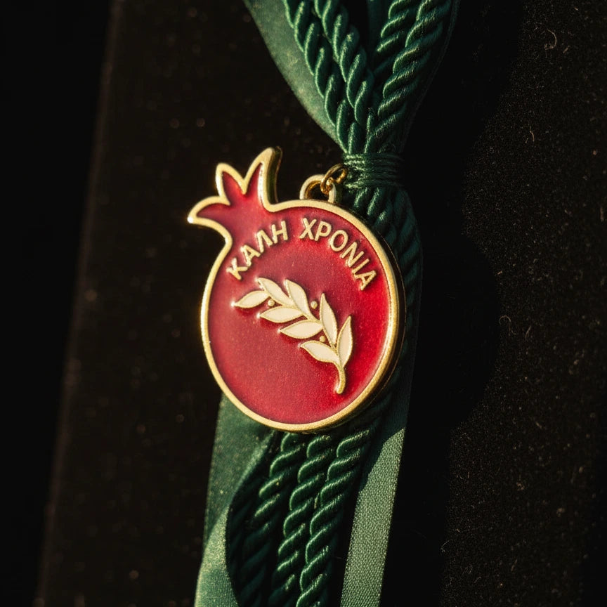 Γούρι ρόδι για το 2026, εμπνευσμένο από την ελληνική παράδοση και σχεδιασμένο με υψηλή αισθητική. Το κόκκινο ρόδι, σύμβολο αφθονίας, τύχης και ευημερίας, πλαισιώνεται από χρυσό κλαδί ελιάς, που εκφράζει ειρήνη, σοφία και μακροημέρευση. Η επιγραφή «Καλή Χρονιά» και το έτος 2026 αποτυπώνονται με κομψότητα, προσδίδοντας εορταστικό χαρακτήρα και συναισθηματική αξία.