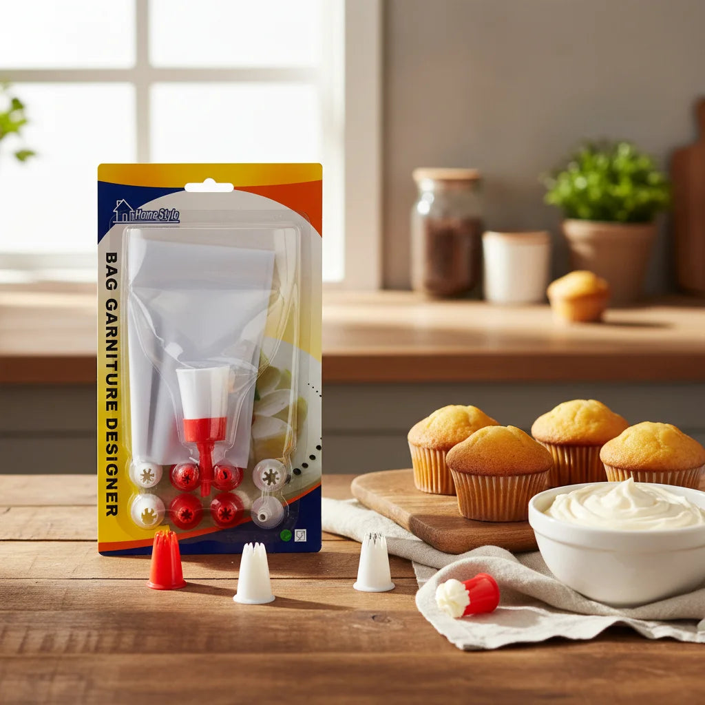 Αναδείξτε τη δημιουργικότητά σας στη ζαχαροπλαστική με το επαγγελματικό σετ σακούλας για σαντιγί HomeStyle. Ιδανικό για διακόσμηση γλυκών, τούρτες, cupcakes και κάθε είδους επιδόρπιο, το σετ περιλαμβάνει ανθεκτική πλαστική σακούλα επαναχρησιμοποίησης και ποικιλία από διακοσμητικές μύτες για δημιουργία εντυπωσιακών σχεδίων.