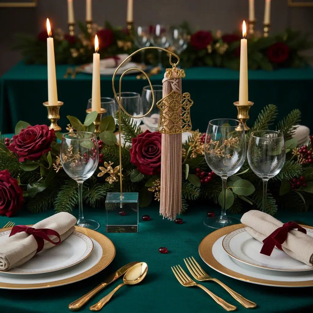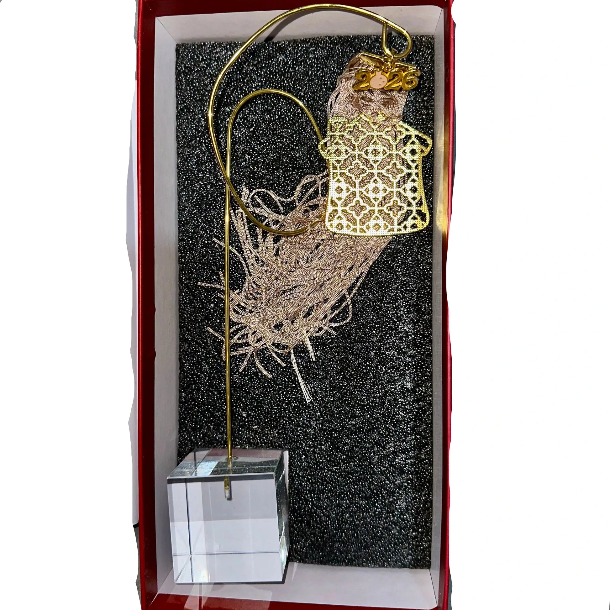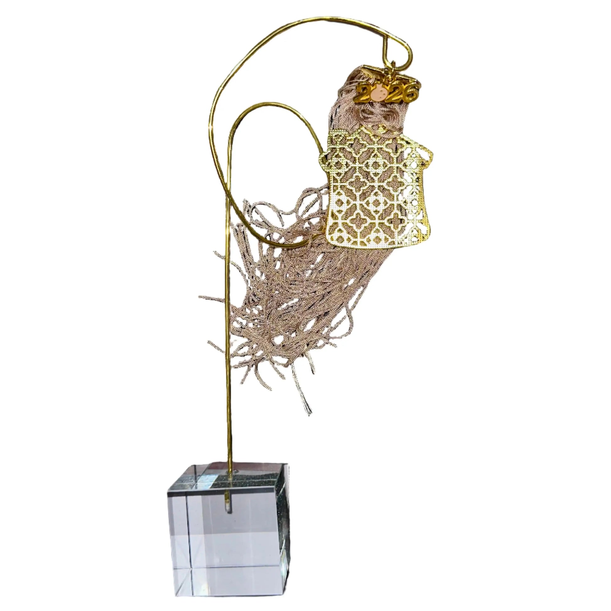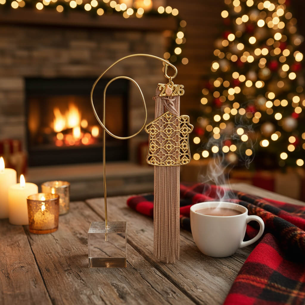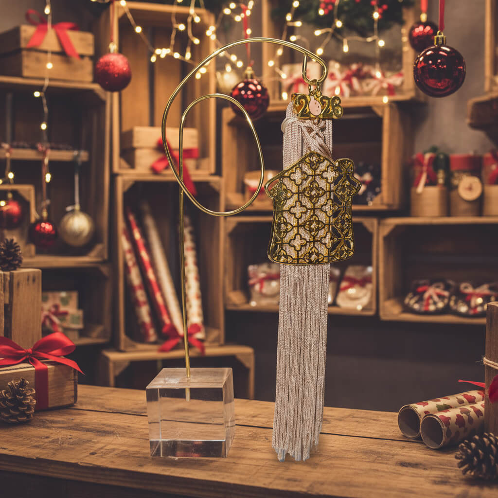 Ένα ξεχωριστό επιτραπέζιο διακοσμητικό για τη νέα χρονιά. Το σχήμα σπιτιού συμβολίζει οικογενειακή θαλπωρή, ενώ οι ευχές Υγεία, Αγάπη, Ευτυχία, Τύχη αποτυπώνονται με χρυσές λεπτομέρειες. Οι φούντες προσθέτουν κίνηση και κομψότητα, ενώ η χρυσή βάση με διάφανη στήριξη το καθιστά ιδανικό για κάθε γιορτινή επιφάνεια. Ένα δώρο με ουσία και αισθητική.