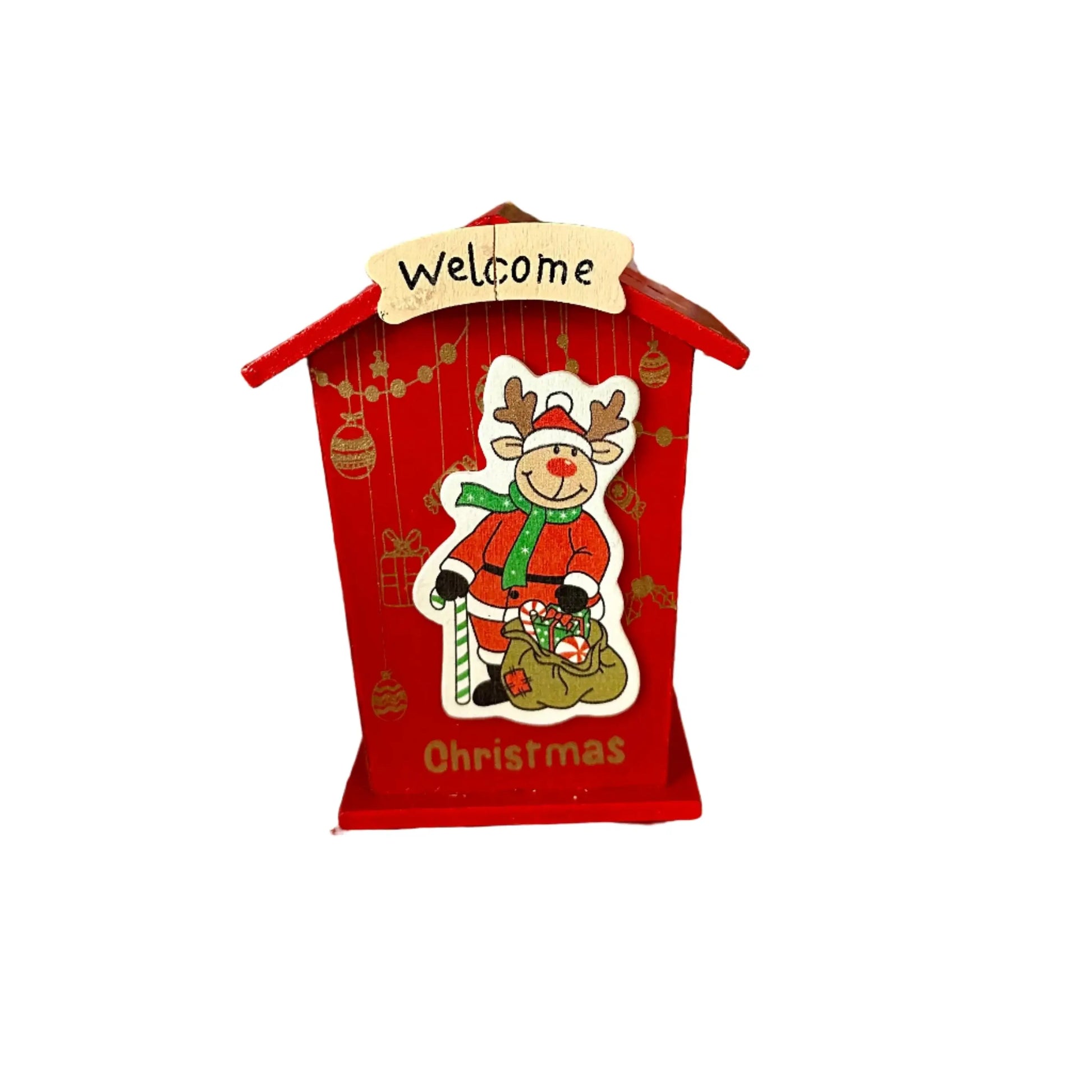 Ένα χαρούμενο χριστουγεννιάτικο στολίδι σε σχήμα σπιτιού, με φιγούρα τάρανδου ντυμένου Άγιο Βασίλη, που κρατά γλυφιτζούρι και σάκο δώρων. Η επιγραφή “Welcome” στην κορυφή και το “Christmas” στη βάση καλωσορίζουν τις γιορτές με παιχνιδιάρικη διάθεση. Ιδανικό για είσοδο, τζάκι ή παιδικό δωμάτιο, προσθέτει χρώμα και χαμόγελο στη γιορτινή ατμόσφαιρα.