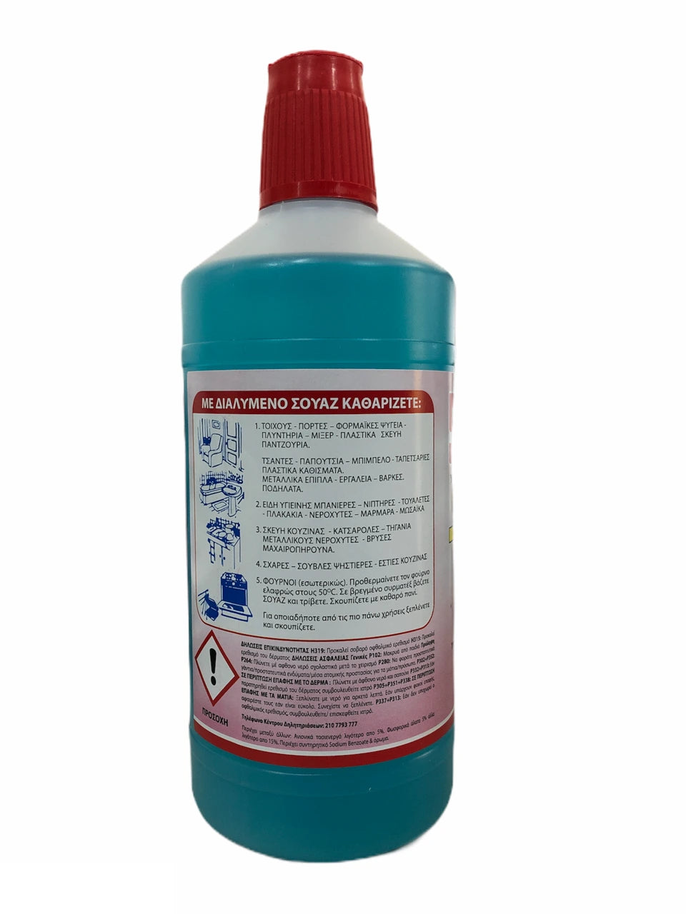 Οδηγίες Χρήσης: Για δύσκολους λεκέδες και γράσα, χρησιμοποιήστε το αδιάλυτο ή με μικρή αραίωση. Για γενικό καθαρισμό και σφουγγάρισμα, διαλύστε την ενδεδειγμένη ποσότητα σε νερό.