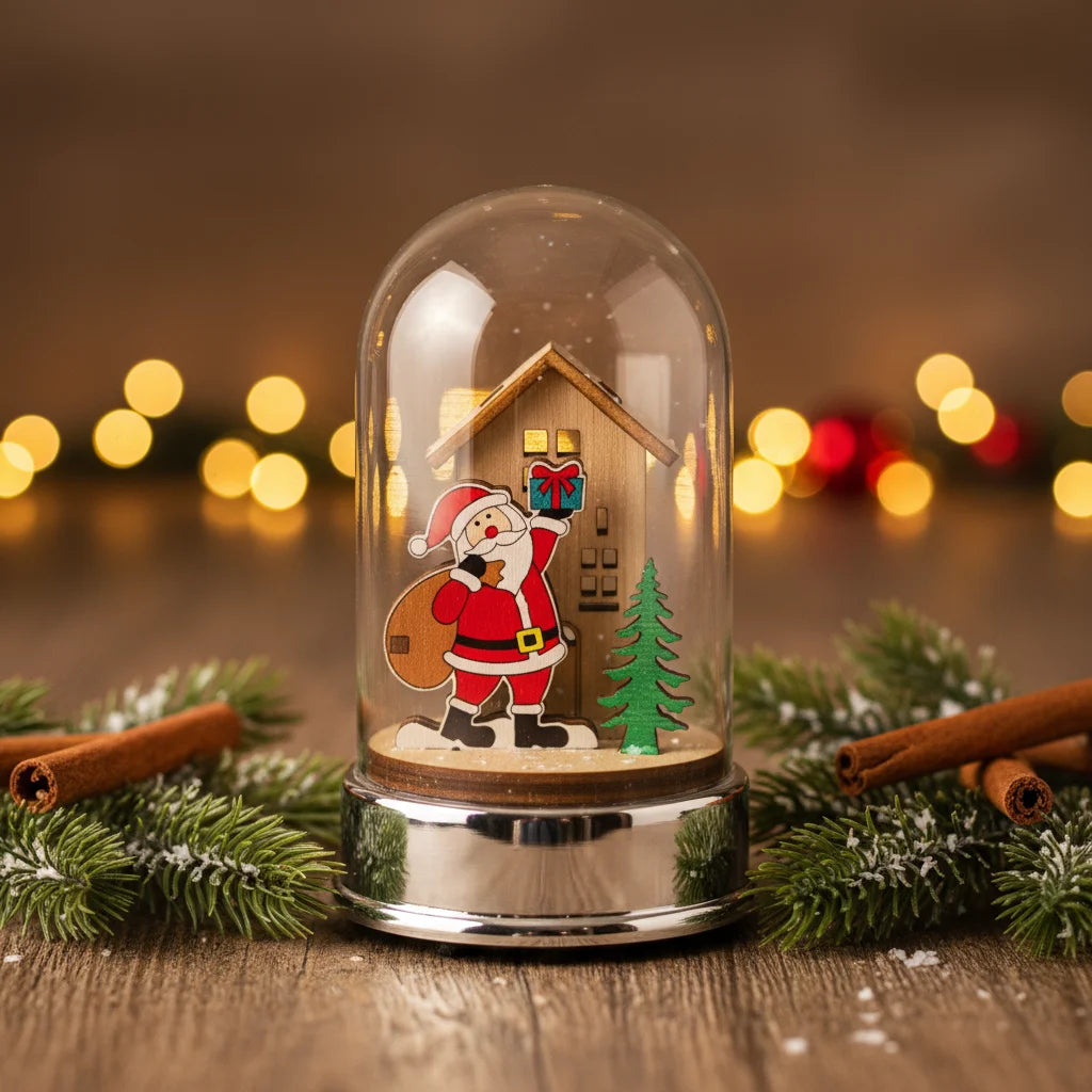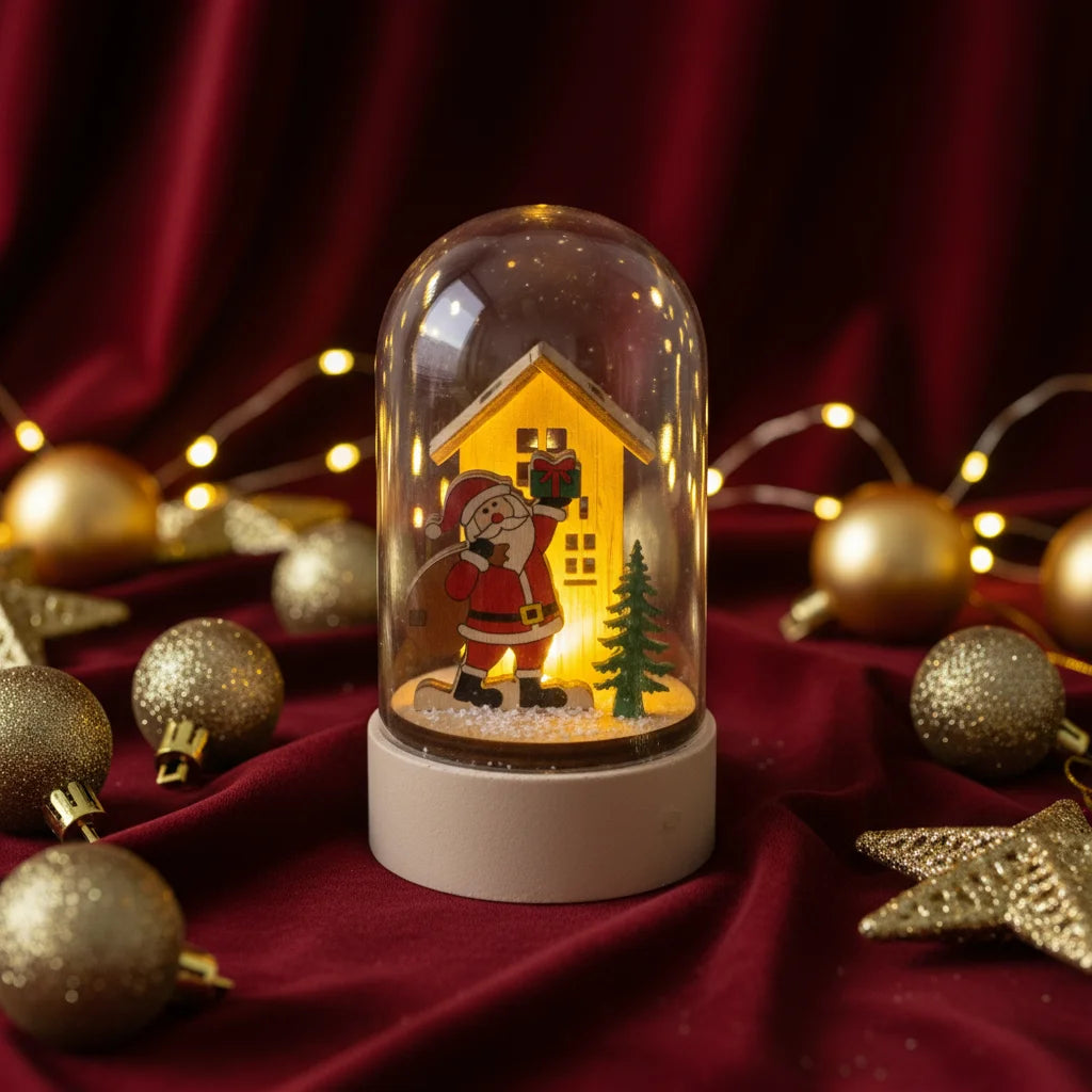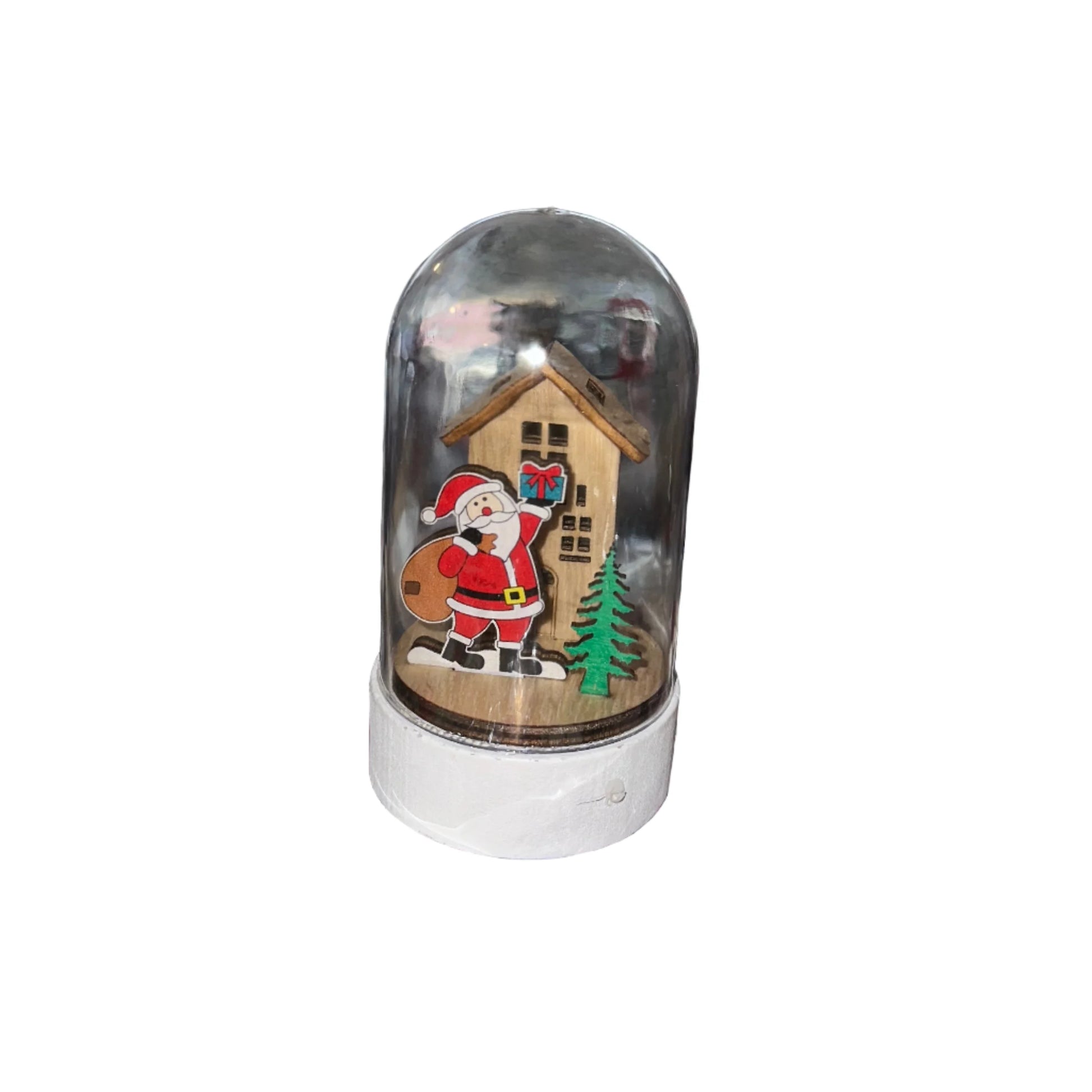 Ένα παραμυθένιο θολωτό διακοσμητικό που φωτίζει τις γιορτές με ζεστασιά και φαντασία. Η σκηνή περιλαμβάνει τον Άγιο Βασίλη με τον σάκο του, ένα φωτεινό σπιτάκι και ένα πράσινο δέντρο, όλα μέσα σε διάφανη θόλο που αγκαλιάζει τη σύνθεση. Το ενσωματωμένο φως LED στο εσωτερικό δημιουργεί ατμόσφαιρα και αναδεικνύει τις λεπτομέρειες. Ιδανικό για το τζάκι, το τραπέζι ή ως δώρο με νόημα.