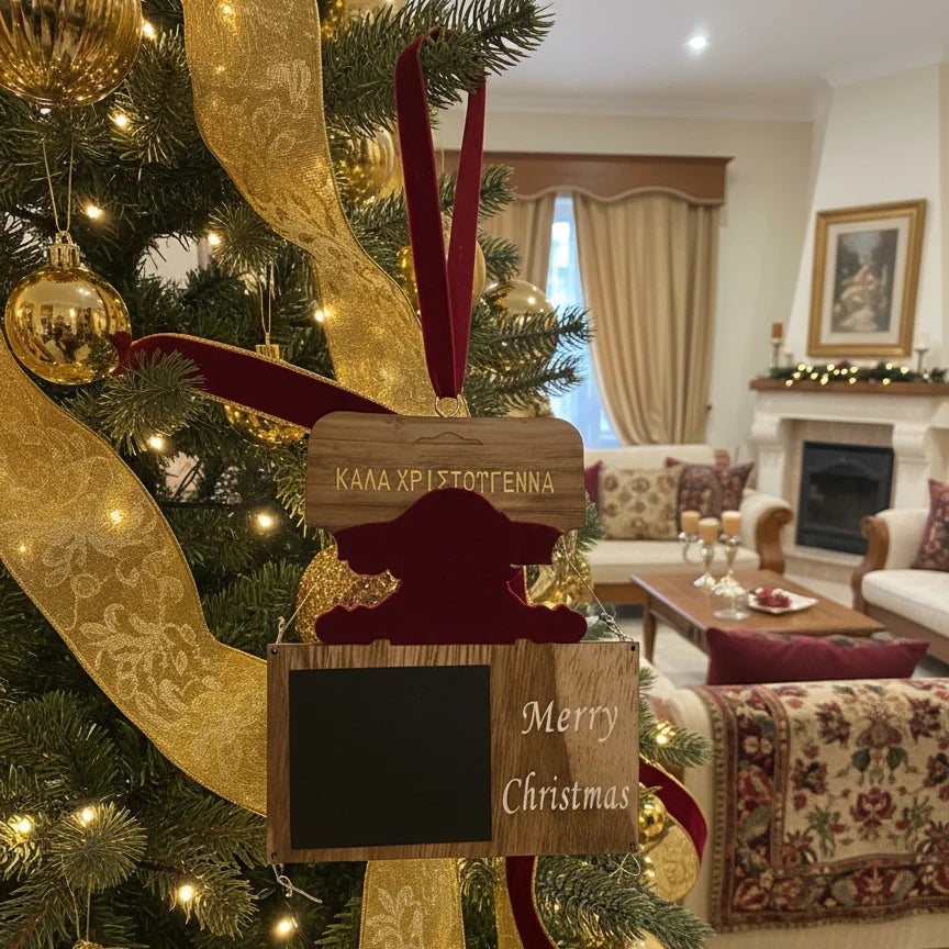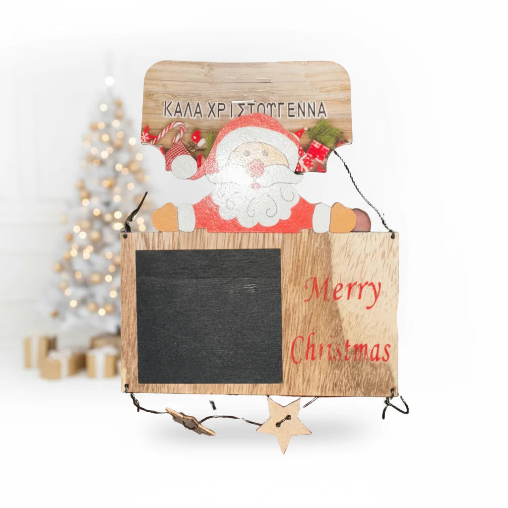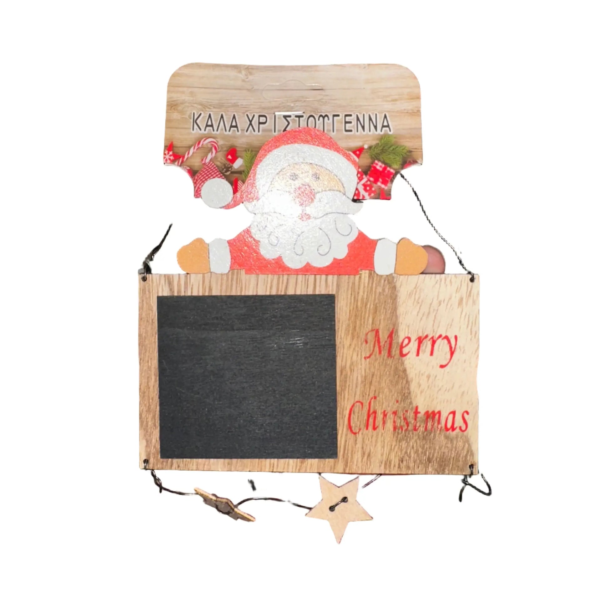 Γιορτινό και λειτουργικό, αυτό το ξύλινο επιτοίχιο στολίδι συνδυάζει ελληνική παράδοση με αγγλική ευχή. Η φιγούρα του Άγιου Βασίλη ή του ταράνδου πλαισιώνει έναν μικρό μαυροπίνακα, ιδανικό για να γράψετε ευχές, μετρήσεις ή χριστουγεννιάτικα μηνύματα. Οι ξύλινες λεπτομέρειες, τα κρεμαστά στολίδια και η διπλή γλώσσα (“Καλά Χριστούγεννα” & “Merry Christmas”) το καθιστούν μοναδικό για κάθε είσοδο, τζάκι ή παιδικό δωμάτιο.