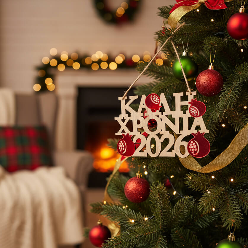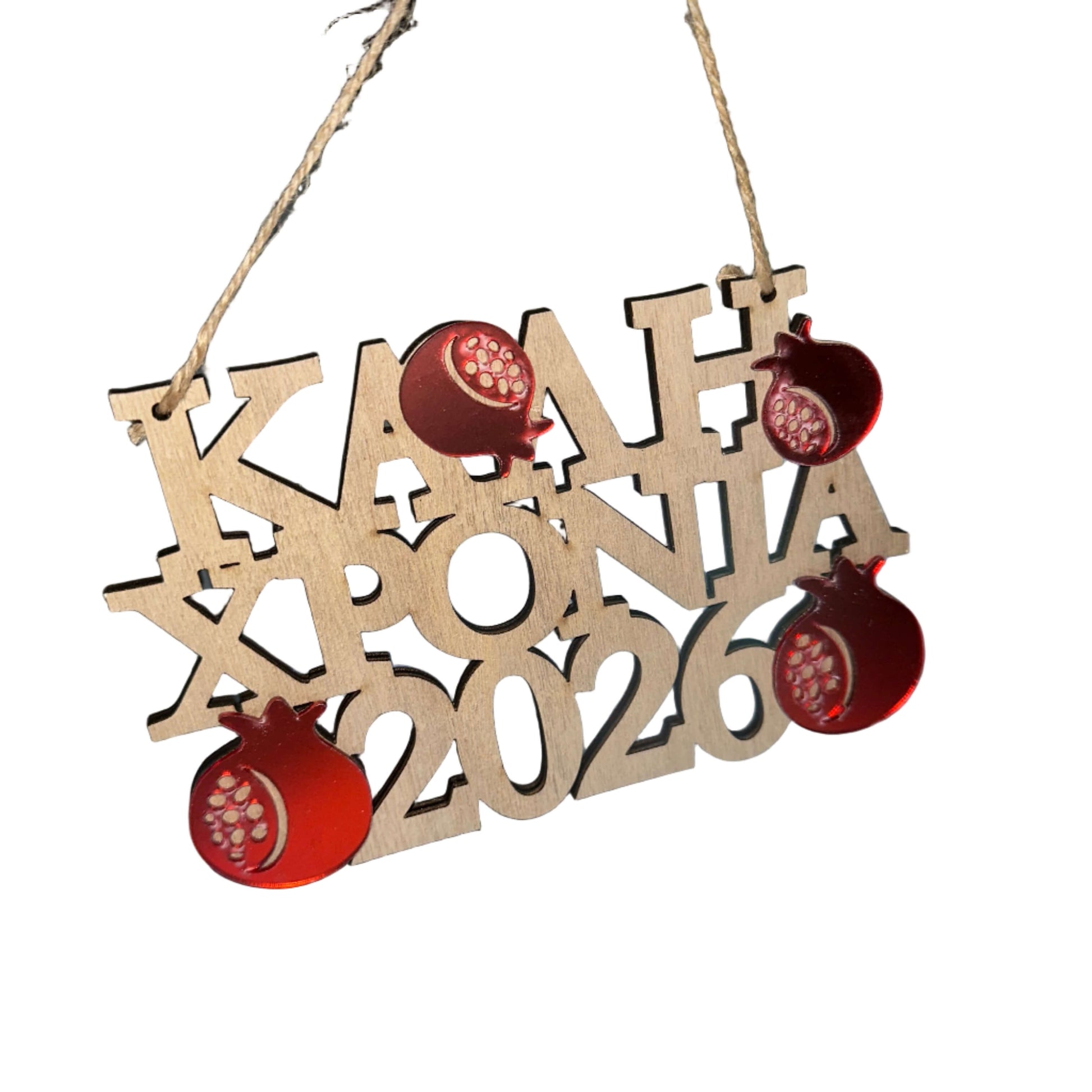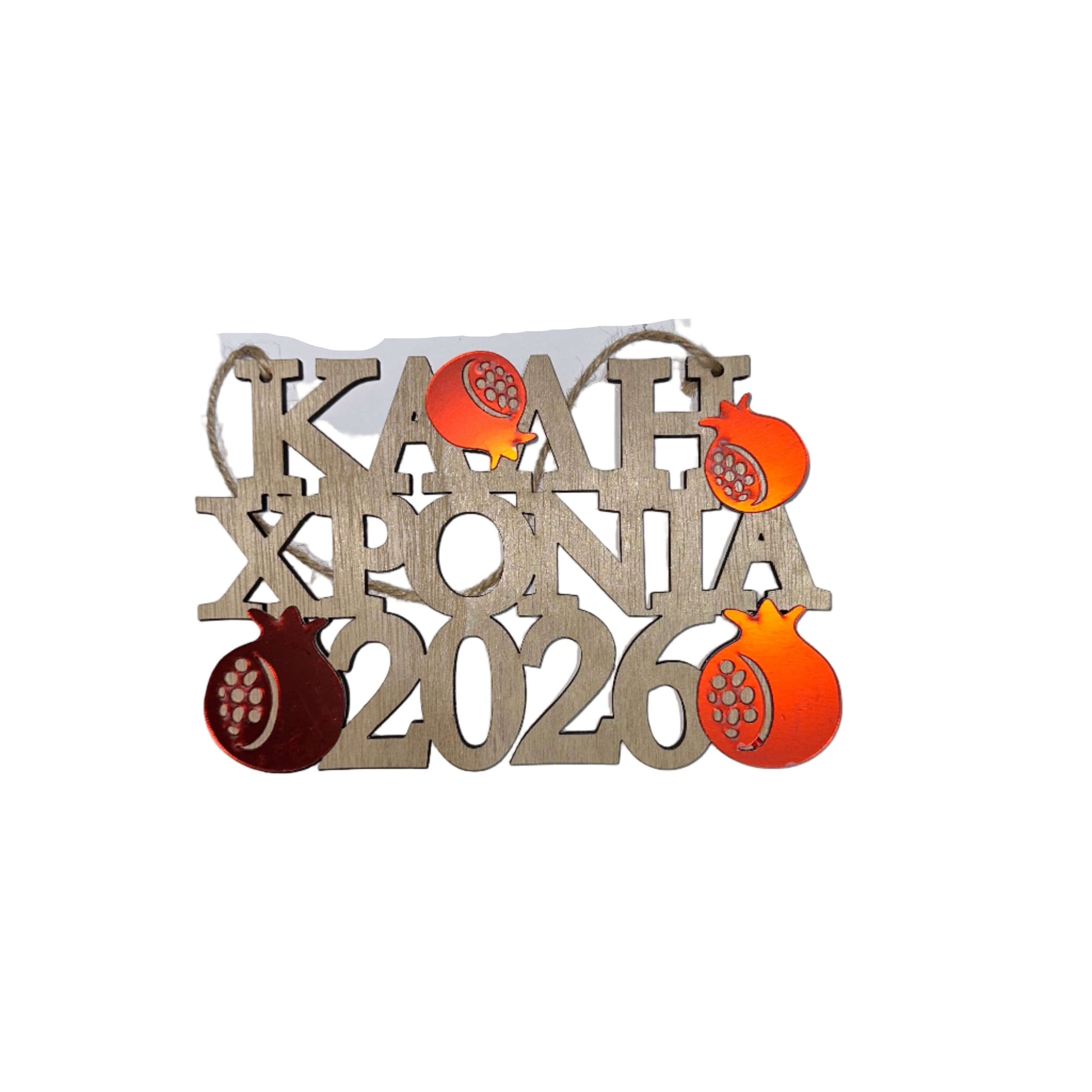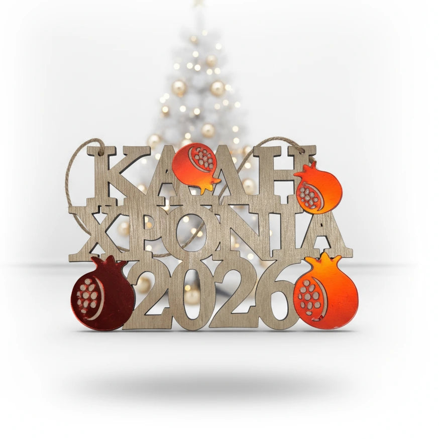 Ξύλινο κρεμαστό στολίδι με την ευχή "ΚΑΛΗ ΧΡΟΝΙΑ 2026" και διακοσμητικά ρόδια σε ζωντανά χρώματα. Ιδανικό για το χριστουγεννιάτικο δέντρο ή ως δώρο ευχών για το νέο έτος. Κατασκευασμένο από φυσικό ξύλο με λεπτομερή λέιζερ χάραξη, συνδυάζει την παραδοσιακή ελληνική αισθητική με μοντέρνο design. Τα ρόδια συμβολίζουν την ευτυχία, την αφθονία και τις καλές ευχές. Περιλαμβάνει κορδόνι για εύκολο κρέμασμα.