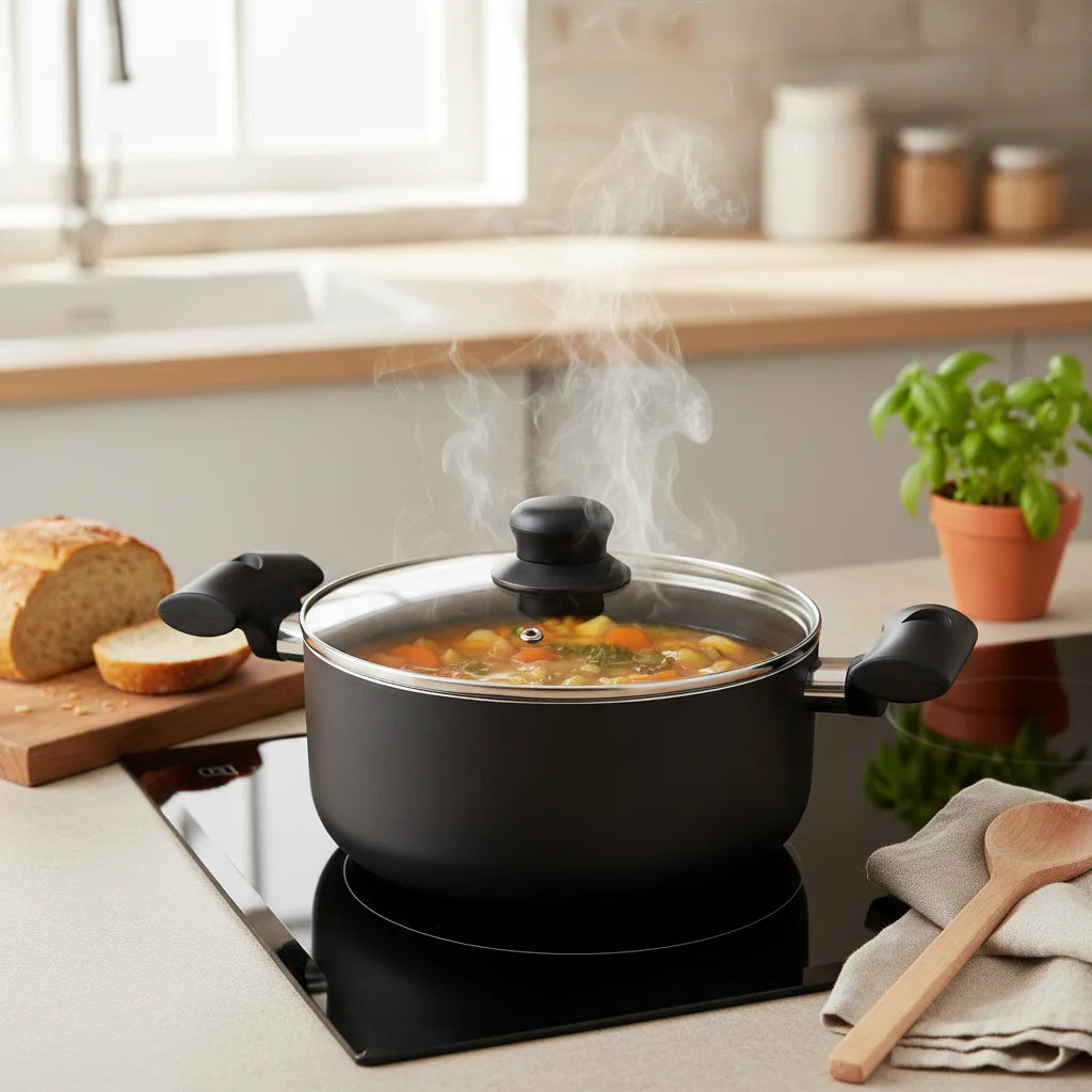 - Οικονομία Ενέργειας: Η άριστη αγωγιμότητα του υλικού και η συμβατότητα με όλες τις εστίες (συμπεριλαμβανομένων των επαγωγικών) επιτρέπουν γρήγορο μαγείρεμα με χαμηλότερη κατανάλωση ρεύματος.