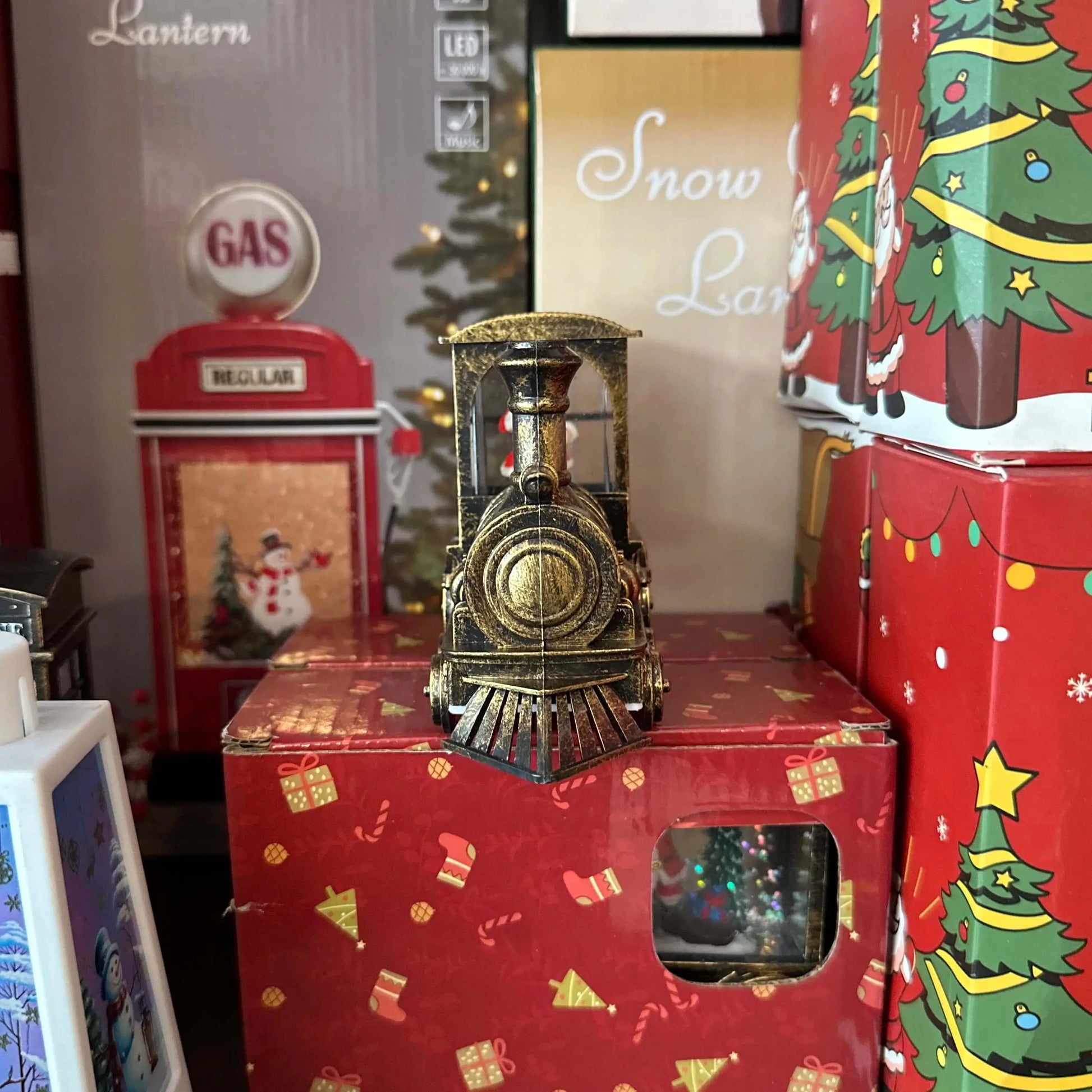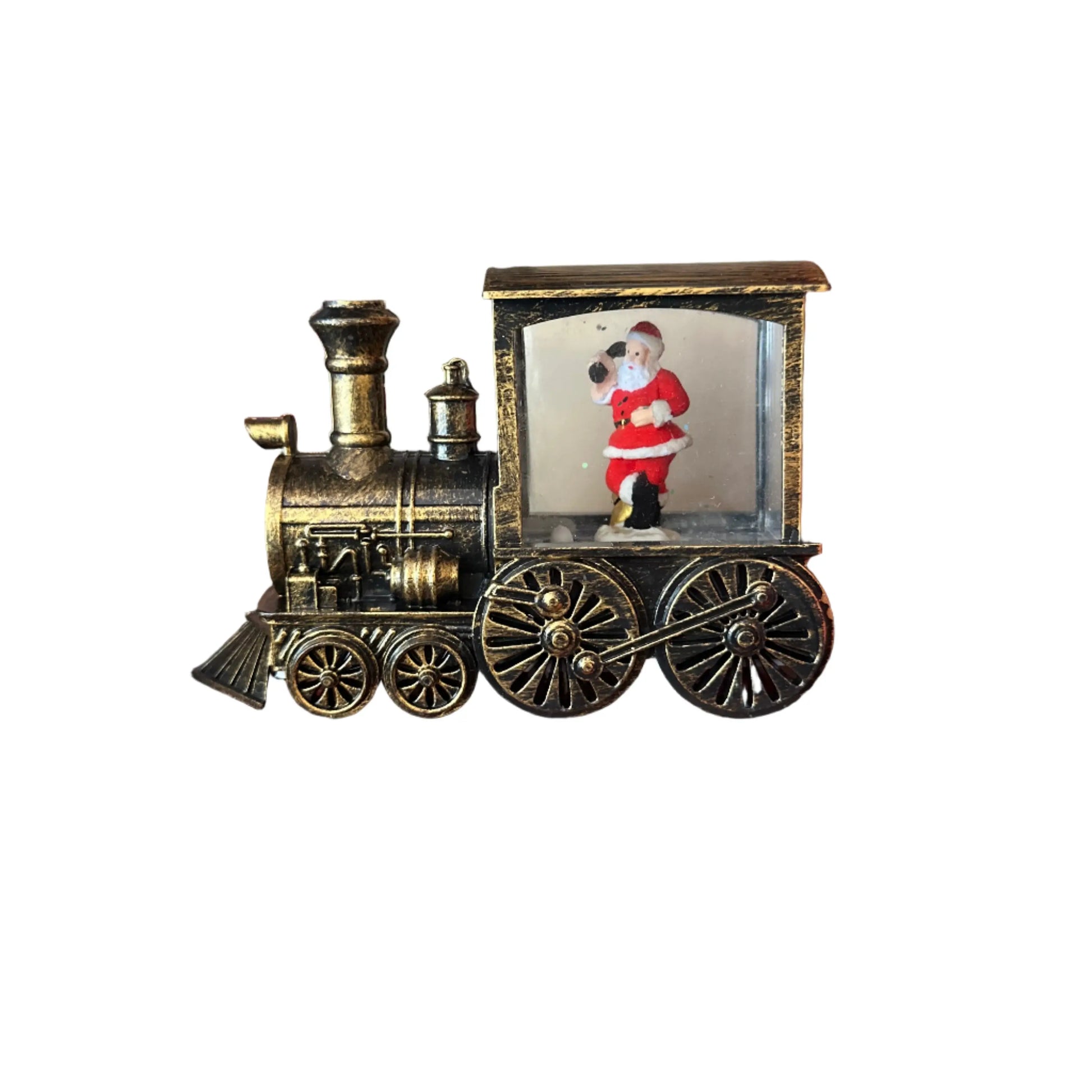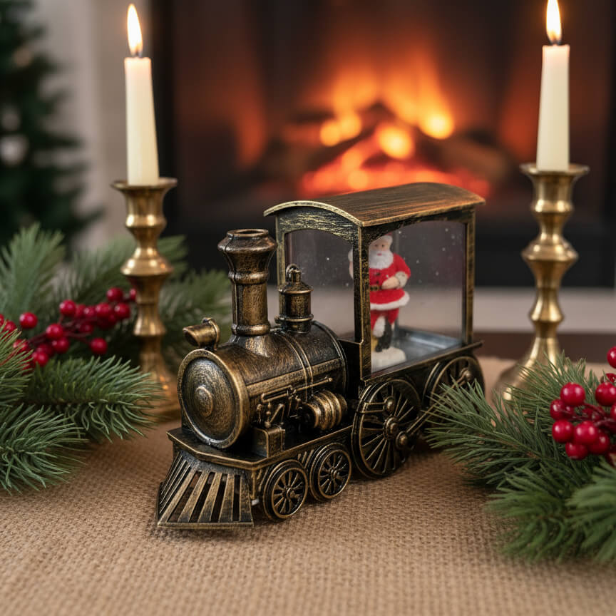 Ένα γιορτινό τρενάκι που συνδυάζει παραδοσιακή αισθητική με μαγική λεπτομέρεια. Η χιονόθολη στο πίσω μέρος φιλοξενεί τον Άγιο Βασίλη μέσα σε σκηνή με τεχνητό χιόνι, ενώ το vintage bronze φινίρισμα προσθέτει ρετρό κομψότητα. Ιδανικό για τραπέζι, τζάκι ή συλλεκτική βιτρίνα, αυτό το στολίδι 18 εκ. δημιουργεί αίσθηση παραμυθιού και γιορτινής θαλπωρής.