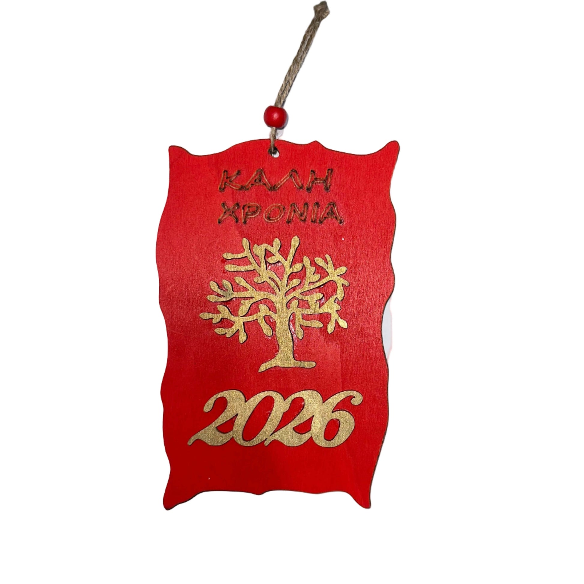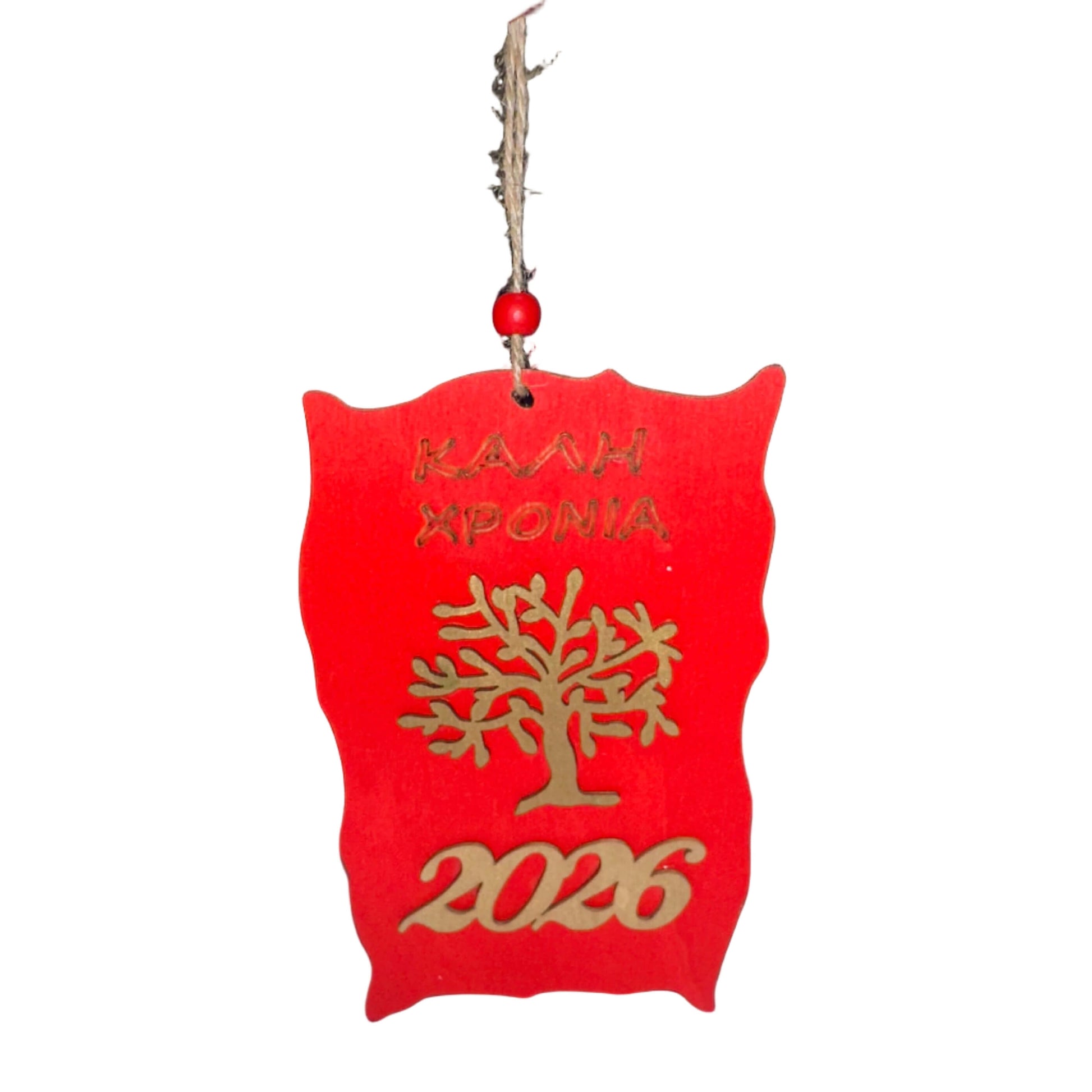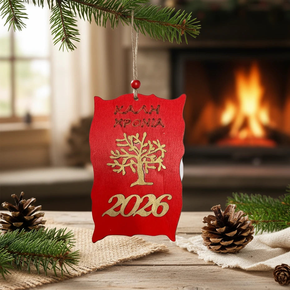Γιορτινό ξύλινο στολίδι με ανάγλυφη επιγραφή «Καλή Χρονιά» και το έτος 2026, σε κόκκινο και χρυσό. Με διακοσμητικό δέντρο και κορδόνι με χάντρα για κρέμασμα. Οι διαστάσεις 8×14 εκ. το καθιστούν ιδανικό για το χριστουγεννιάτικο δέντρο, το τζάκι ή ως δώρο με συναισθηματική αξία. Συνδυάζει χειροποίητη αισθητική με εορταστική κομψότητα.